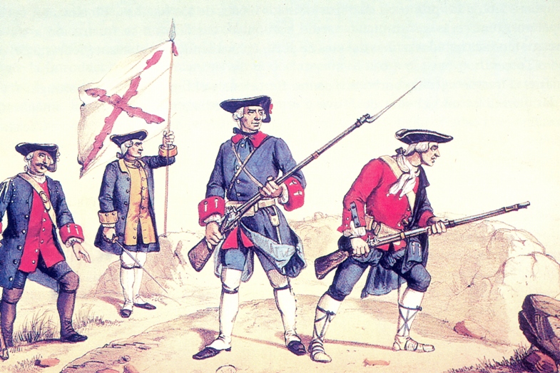 De izquierda a derecha: Escopetero de Andalucía; Alférez de Niebla; Fusileros de Baza y Cataluña. Grabado de "Guerreros del mundo"