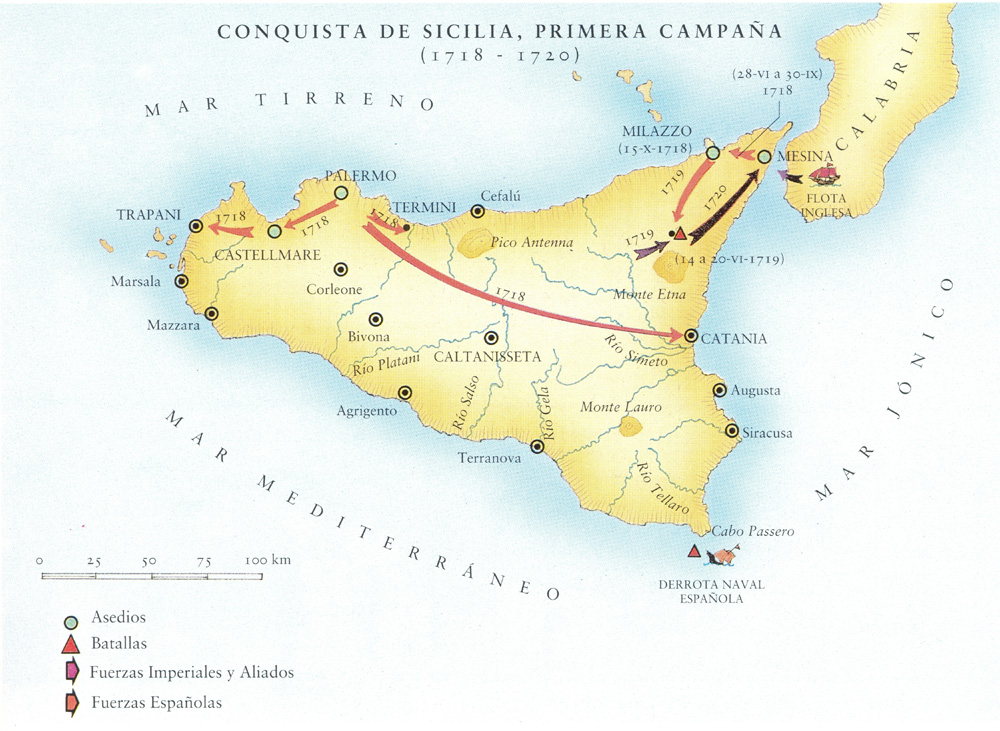 Tras el éxito inicial, el ejército español se dividió en dos fuerzas: la primera, al mando del conde de Montemar, se dirigió hacia Trapani, Términi y Catania. La segunda, al mando del Marqués de Lede, se dirigió hacia Messina, donde se habían concentrado las tropas austríacas y las de la Casa de Saboya, donde también se dirigió la flota española.