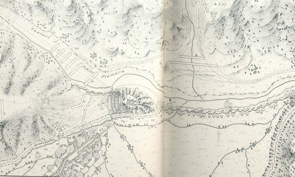 Plano de la batalla de Francavilla. Este fue el momento elegido por los imperiales para atacar en fuerza. Al ataque de la tercera columna en el llano del montecillo de los Capuchinos se unió el ataque de las seis divisiones de la segunda columna, ya citado. El ataque de la tercera columna fue rechazado por el violento fuego de los españoles, que obligó a los imperiales a replegarse y guarecerse en un barranco [I], donde a pesar de todo sufrieron numerosas bajas. El general Caracciolo, encuadrado en el ejército español, resultó mortalmente herido en los combates, así como el general alemán Holstein, que mandaba el ataque.