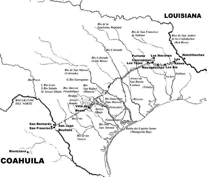 Reforzamiento de la posición española en Tejas ante el avance francés. El marqués de San Miguel de Aguayo era un noble español residente en Coahuila que obtuvo su título y su fortuna al casarse con una de las viudas más ricas de Nueva España. Como respuesta a la aparente ofensiva francesa en Tejas, el marqués ofreció su vida y su fortuna al rey para hacer retroceder a los franceses, y evitar así la amenaza que se cernía sobre el norte del virreinato de Nueva España tras el ataque francés a Florida y su avance en el este de Tejas. El marqués recibió el título de capitán general y gobernador de Coahuila y Tejas, y reunió una fuerza de 500 hombres, 3600 caballos, 600 reses de ganado vacuno, 900 ovejas y 900 mulas, la mayoría de éstas últimas cargadas con suministros e impedimienta. La expedición incluía a los frailes agustinos Padrón y Guzmán, Matías Sáenz, Pedro de Mendoza y Margil. Incluía al capitán Domingo Ramón, a quien Aguayo envió por la costa hacia el fuerte de San Luis, destruido por el francés La Salle 30 años antes. La expedición del marqués de Aguayo fue la expedición más grande que cruzaría el rio Grande hasta la entrada del general Santa Ana en Tejas en 1836, 115 años más tarde. Con ella, el marqués expulsó a los franceses del este de Tejas, aseguró el dominio de España en el territorio de manera que los franceses nunca más lo amenazaron, y sentó las bases de su colonización. En cada uno de los ríos que cruzaba dejaba caballos y ganado vacuno y ovino, de manera que fueron el origen de lo que con el correr de los tiempos fueron los grandes rebaños de los famosos caballos mustang tejanos y de los inmesos rebaños de ganado vacuno del territorio. La columna española inició la marcha desde Monclova el 15 de noviembre de 1720. A principios del verano de 1721 comenzó a atravesar las calusosas llanuras tejanas. A finales de julio de 1721 encontró a los franceses a orillas del río Neches, en los bosques de los límites de la Luisiana. Desde primeros de año el contingente francés del fuerte de Natchitoches estaba al mando del comandante Saint-Denis, que se había distinguido en la segunda toma de Pensacola. El francés había planeado un ataque a San Antonio, y el gobierno francés lo había aprobado; pero tuvo que desistir de él ante la presencia y superioridad de la columna del marqués de Aguayo, y aceptó retirarse del este de Tejas. Tras haber expulsado a los franceses, el marqués de Aguayo se dedicó a organizar y reforzar la presencia española en Tejas. Entre san Antonio de Béjar y la frontera con Luisiana el marqués asentó a 400 familias, procedentes la mitad de Galicia, islas Canarias y la Habana, y la otra mitad de indios tlaxcalán leales a España. Cuando abandonó el territorio el 31 de mayo de 1722 Tejas contaba con cuatro presidios, diez misiones y una villa, constituidos fundamentalmente de la siguiente forma: |