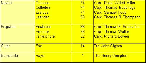 Buques que formaban el escuadrón británico del almirante Nelson. El THESEUS fue el buque insignia. El LEANDER se unió a Nelson en aguas de Santa Cruz el 24 de julio, procedente de Lisboa.