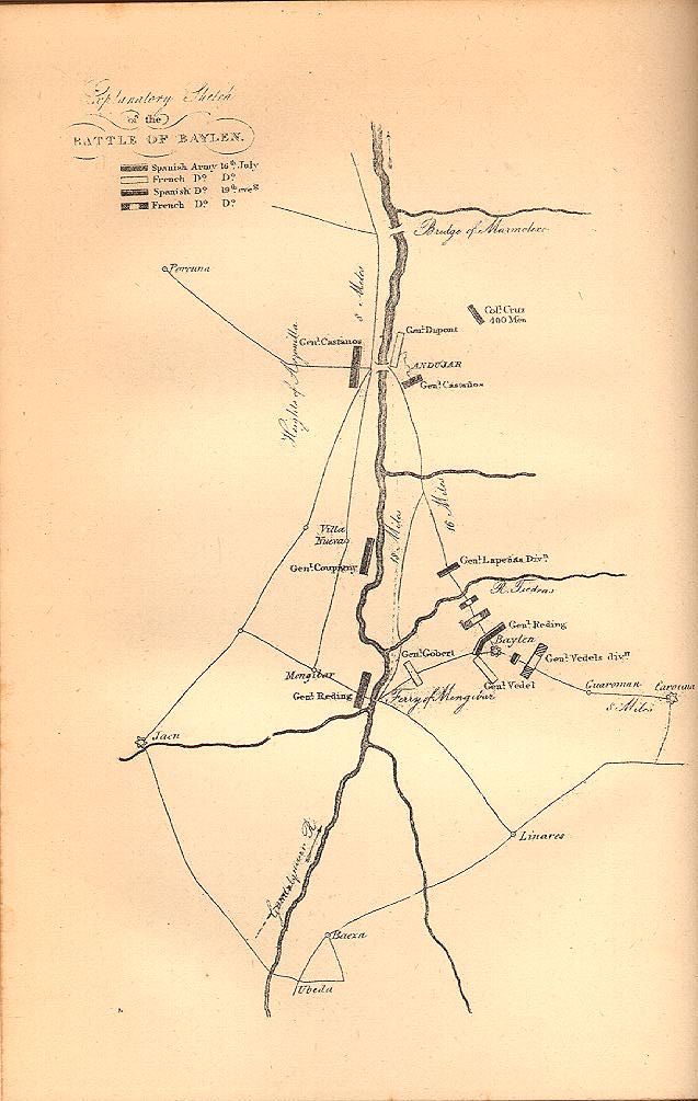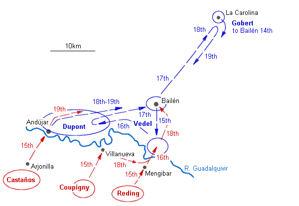 Croquis de la campaña de Dupont en Andalucía, tomado de Priego López (op. cit, tomo II) 1ª fase (23 de mayo - 2 de junio) El 23 de mayo de 1808 las unidades de la columna principal iniciaron su marcha. La Brigada de Cazadores del general Dupré iba en varguardia seguida por la Brigada de Infantería del general Pannetier; escalonados con un fondo de 125 kilómetros y con un día de distancia una de otra marchaban la Brigada de Infantería del general Chabert; la Brigada de Dragones del general Privè, el Batallón de Marinos del coronel Daugier y, cerrando la marcha, la Brigada Suiza del general Rouyer. El 31 de mayo la columna francesa atravesó el desfiladero de Despeñaperros sin novedad. Al llegar a La Carolina se encontraron la población desierta. En el mismo estado de abandono encontraron los pueblos de Guarromán y Bailén. El día 2 de junio el general Dupont entró en Andujar, donde se enteró del levantamiento general de las provincias andaluzas y de la existencia de concentraciones de tropas regulares y de voluntarios que pretendían salirle al paso, por lo que solicitó al general Belliard, Jefe de Estado Mayor del mariscal Murat, que el general Avril le esperase en Sevilla y que la División Vedel iniciara su marcha hacia Andalucía. 2ª Fase (2 al 18 de junio) La columna francesa prosiguió el avance los días 4 y 5 de junio con intención de entrar en Córdoba e ignorando que los españoles habían bloqueado el paso de Despeñaperros a su espalda. Mientras tanto, la Junta de Sevilla, enterada de que los franceses habían atravesado Sierra Morena, decidió atender la defensa de Córdoba, por lo que el avance francés chocó con la primera resistencia organizada a 11 kilómetros al norte de esta ciudad el día 7 de julio, dando lugar al combate del Puente de Alcolea en el que los españoles fueron puestos en fuga en apenas dos horas de lucha y ocasionando la sangrienta entrada de los franceses en Córdoba aquella misma tarde. Dupont permaneció en Córdoba hasta el día 16 de junio. En vista de las noticias inquietantes que fue recibiendo sobre el volumen el alzamiento español, ese mismo día inició su retirada sobre Andújar para buscar protección entre los ríos Guadalquivir y Jándula . Dos días más tarde llegó a Andújar, donde encontró que los paisanos armados habían dado muerte al destacamento de retaguardia allí dejado, igual que hicieron con el destacamento francés dejado para custodiar el puente sobre el Guadalquivir los lugareños del pueblo de Montoro con su alcalde al frente. 3ª Fase (18 de junio al 14 de julio) La apreciación que Dupont hizo del alcance de la sublevación española era tal que el mismo día de su entrada en Córdoba solicitó al general Belliard que la División Vedel bajase a reforzarle a Sevilla y que su tercera división del general Frère se desplegase entre Córdoba y Granada, todo ello para hacer frente a las fuertes tropas rebeldes que suponía enfrente suya. En efecto, el general Castaños estaba organizando el Ejército de Andalucía desde el 9 de junio a raiz de la derrota de Alcolea, convirtiendo los alrededores de Utrera en un inmenso campo de instrucción. El día 26 de junio la Junta de Sevilla pasó revista a las tropas. Castaños partió con su ejército en dirección a Córdoba y Ecija a los pocos días, avanzando despacio para completar la instrucción de sus tropas. El día 11 de julio se reunió con las fuerzas del Reino de Granada en la localidad de Porcuna, con lo que las tropas españolas sumaron unos 29.300 hombres y 28 piezas de artillería. En esa misma localidad se decidió el plan a seguir. En líneas generales el plan del genera Castaños (conocido como el plan de Porcuna) consistía en cruzar el rio Guadalquivir entre Mengíbar y Villanueva de la Reina con la 1ª y 2ª divisiones al mando del mariscal de campo Reding y del marqués de Coupigny respectivamente, reorganizar sus tropas en Bailén y avanzar hacia Andújar para atacar al enemigo por la espalda. Mientras tanto, el propio Castaños fijaría a Dupont en Andujar con su 3ª División al mando del general Jones y la reserva del general Lapeña para hacer creer al francés que el ataque principal vendría desde su frente. Era un plan muy arriesgado e imprudente, pues se basaba en un conocimiento incierto del enemigo y exigía una marcha de unos 40 kilómetros paralelo al flanco izquierdo del ejército francés. El 13 de julio los españoles iniciaron los movimientos para llevar a cabo el plan.