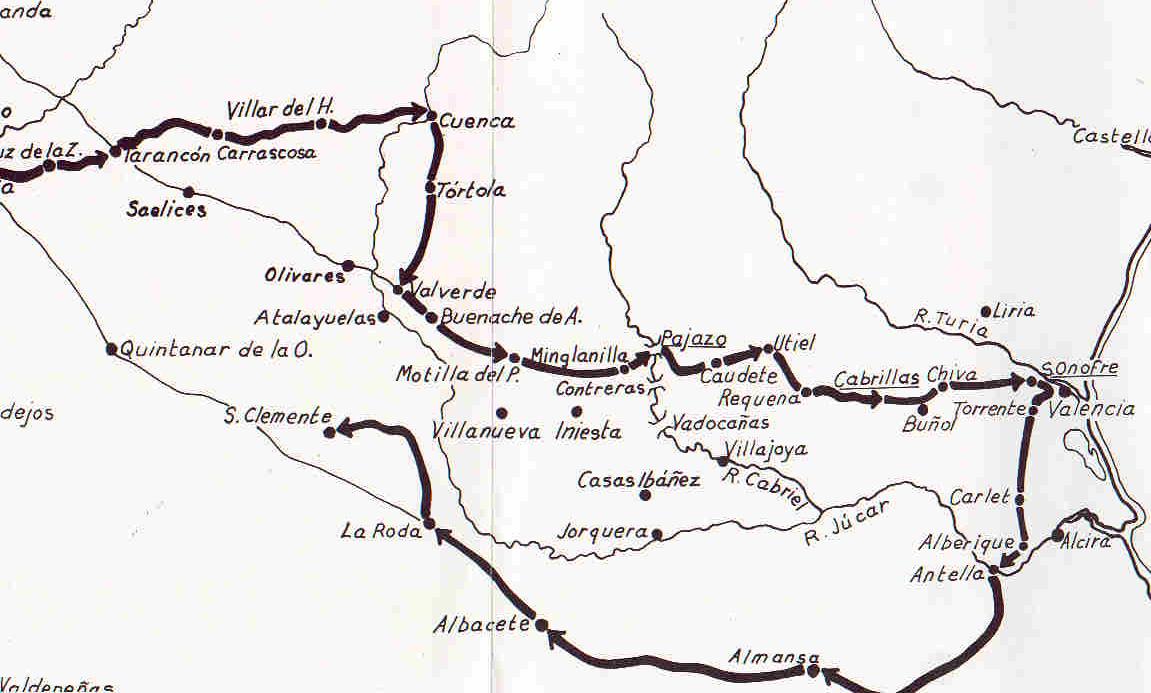 Croquis de la expedición de Moncey contra Valencia, tomado de Priego López (op. cit, tomo II) 1ª fase (del 4 al 18 de junio) El día 4 de junio el mariscal Moncey salió de Madrid y pernoctó en Pinto. Su idea era avanzar no por la carretera principal Madrid-Valencia, que discurría al sur del río Júcar pasando por Albacete y el puerto de Almansa, sino por el trayecto de montaña más quebrado y abrupto que discurría al norte del río Júcar y que pasaba por Cuenca y el río Cabriel. Esta decisión se debió a que Moncey preveía que los españoles le irían a interceptar el puerto de Almansa, como así ocurrió. El día 5 llegó a Aranjuez. El día 6 llegó a Santa Cruz de la Zarza. El día 7 llegó a Tarancón y concedió a sus cansadas tropas un día de descanso. Allí recibió inquientantes noticias sobre el alcance de la rebelión española: Cuenca estaba agitada y el correo con Valencia interrumpido. El día 9 llegó a Carrascosa del Campo. El día 10 llegó a Villar de Horno. Allí los franceses fueron recibidos con hostilidad por parte de los lugareños, que se negaron a aprovisionar a las tropas extranjeras. El día 11 llegó a Cuenca. Durante el camino las tropas francesas se encontraron con desertores españoles que se dirigían a Valencia. En Cuenca se le anunció a Moncey que los españoles estaban organizándose de Requena. Por ello el mariscal decidió no seguir avanzando y envió despachos al general Chabran, que suponía en Tortosa, diciéndole que el dia 23 esperaba estar con sus tropas en Requena y Chabrán con las suyas en Castellón, para marchar juntas sobre Valencia. Mientras tanto, las Juntas de Murcia y Levante habían juntado un ejército de unos 37.000 hombres, denominado Ejército de Levante, y formado por las unidades estacionadas en estas provincias, las unidades que habían llegado procedentes de Madrid y del alistamiento general de todos los varones entre 16 y 40 años. Este ejército se puso al mando del teniente general conde de Cervellón. El plan del teniente general era enfrentarse al enemigo en Almansa. Lo más extraño es que mantuvo este plan a pesar de las evidencias de que Moncey había cambiado su itinerario para evitar el encuentro con los españoles. Tuvo que ser la Junta de Valencia quien rectificara el despliegue y ordenara la marcha hacia Requena; pero ya fue demasiado tarde: