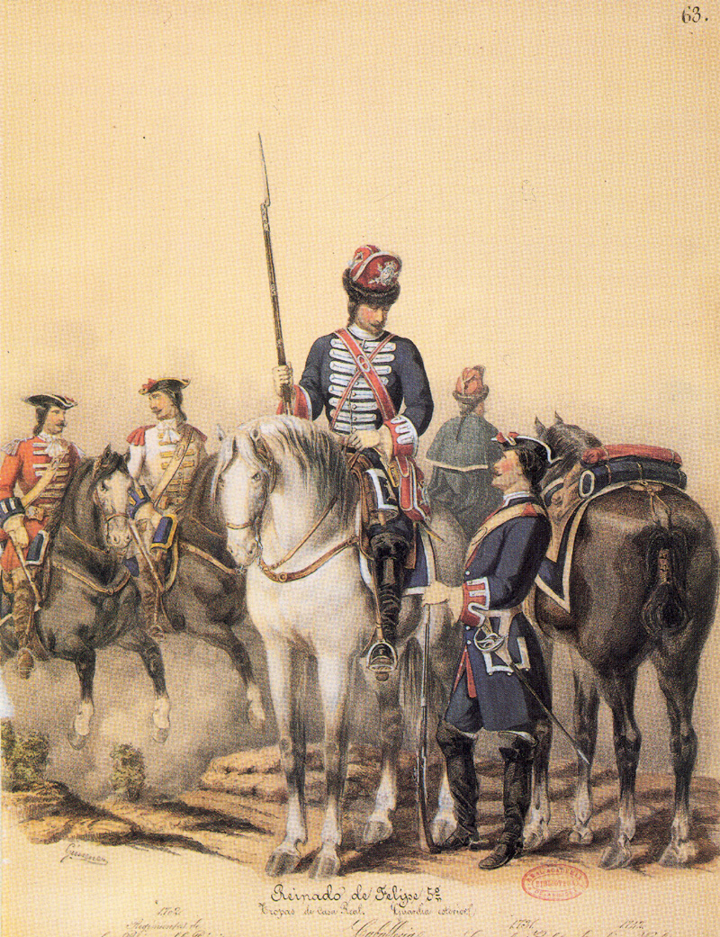 Tropas de la Casa Real del reinado de Felipe V. Academia de la Historia. Madrid. Durante la guerra contra la República Francesa (1793-95), las tropas de la Casa Real se destacaron por su valor, combatiendo siempre en los puntos de mayor peligro, disciplinada e impertérrita en todas las ocasiones, quedando en cuadro en ocasiones pero sin ceder terreno. En 1808 la Guardia Real contaba con seis batallones y seis escuadrones que encuadraban a 264 jefes y oficiales, 7.284 soldados y 1.117 caballos. Los coroneles jefes de los regimientos y los comandantes jefes de los batallones y escuadrones tenían el grado de Teniente General y Mariscal de Campo, debido a la alta consideración que los reyes borbones habían querido dar a las tropas de la Casa Real. En 1808 se articulaban de la siguiente manera: |