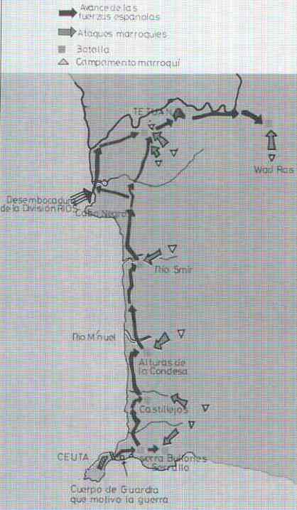 Previamente a la llegada del grueso del ejército a Ceuta, el mando español decidió mejorar las defensas de la plaza y expulsar a las tropas moras [04] de sus posiciones. Para ello el 12 de diciembre se desataron las hostilidades por la columna mandada por el general Echagüe, que tomó la fortificación de El Serrallo. Cinco días después, el 17 de diciembre, el general Zabala ocupó la Sierra de Bullones. El resto de las tropas fue desembarcando paulatinamente en Ceuta, donde acabaron de concentrarse el 21 de diciembre, momento en que el general O´Donnell se puso al frente del Ejército Expedicionario. El día de Navidad los tres cuerpos de ejército habían consolidado sus posiciones y esperaban la orden de avanzar hacia Tetuán.