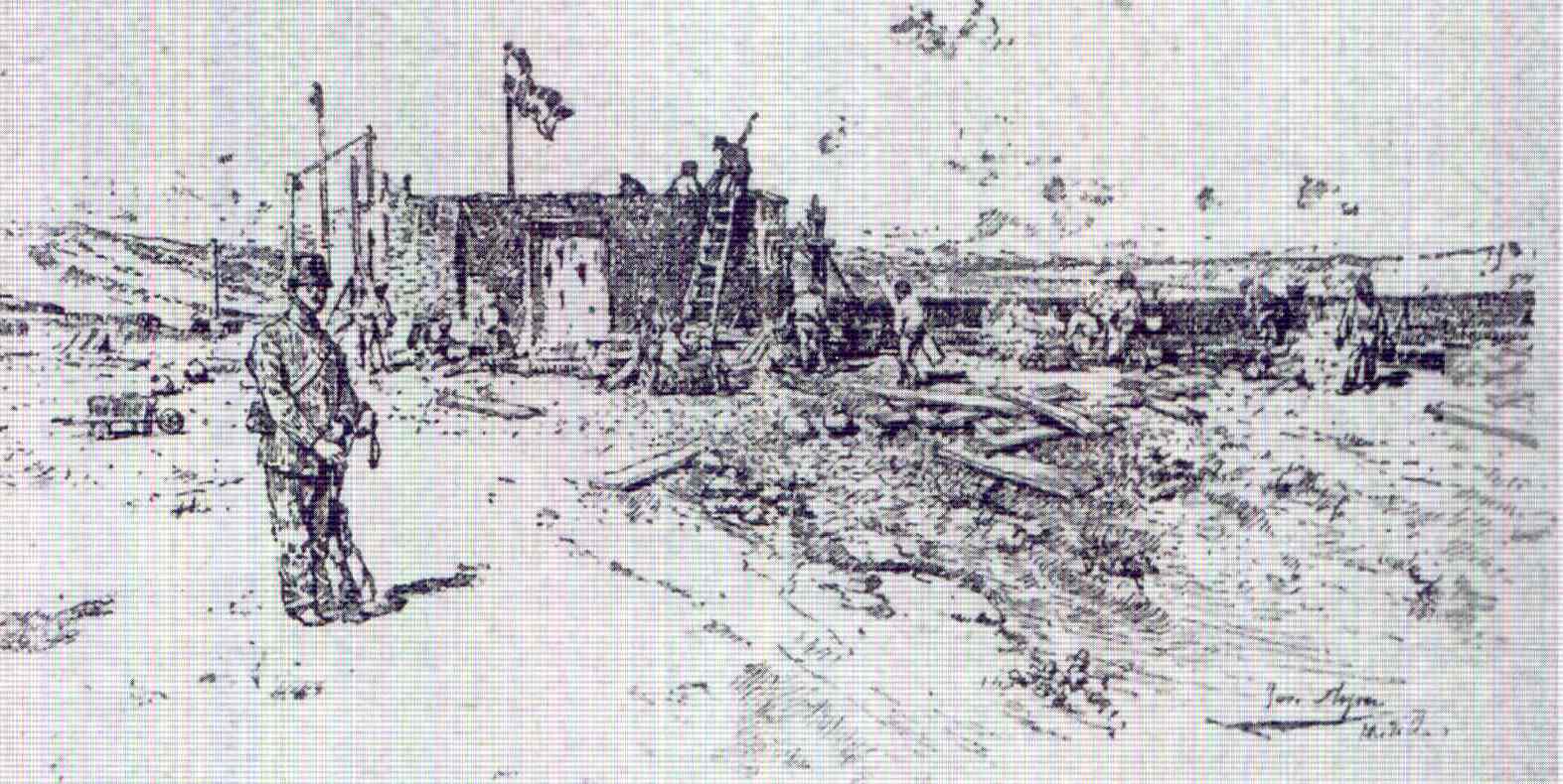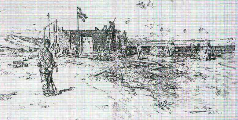 Fuerte en construcción de Sidi Guariach. Revista Blanco y Negro, núm. 132 de 1893. Archivo del Museo Específico de Regulares de Ceuta. El 2 de octubre los moros realizaron un segundo ataque, esta vez de día y contra los trabajadores y la compañía de Ingenieros que se encontraban en el lugar de las obras. El elevado número de atacantes, cifrado en unos 4.000, forzó la retirada de los españoles y la salida del general García Margallo hasta el fuerte de Camellos al frente de cuantas tropas pudo reunir para proteger la retirada del destacamento de Sidi Guariach. De nada sirvieron las protestas del gobierno español ante el Sultán de Marruecos, pues los días 27 y 28 de octubre los moros realizaron un tercer ataque a Melilla, con tal violencia que lograron cercar las tropas españolas acuarteladas en el fuerte de Cabrerizas Altas, a cuya entrada murió el general García Margallo. Era preciso enviar refuerzos a los sitiados, pero éstos debían de llegar siguiendo un determinado plan. Para ello se necesitaba enviar un correo que rompiera el cerco del fuerte, corriera por la tierra de nadie y llegara al fuerte de Rostrogordo. El capitán Picasso, que pasaría porteriormente a la Historia como el juez instructor del Informe Picasso sobre el Desastre de Annual, se presentó voluntario. Una escolta de 25 hombres le cubriría. Al salir del fuerte de Cabrerizas Altas los moros comenzaron a disparar sobre ellos. El capitán Picasso, montado sobre su caballo "Príncipe", recién asignado el 9 de octubre pasado, decidió salir solo a todo galope "con inminente riesgo de su vida".