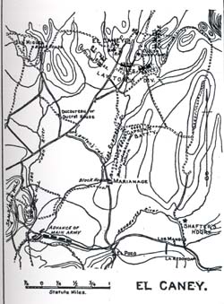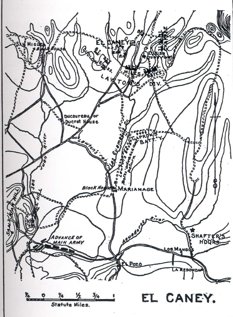 Plano norteamericano de la posición de El Caney y de las colina de San Juan, con indicación del despliegue norteamericano. La posición tenía por misión impedir que los norteamericanos se apoderaran de la represa de agua existente de Cuabitas que abastecía la ciudad de Santiago, y de la vía férrea que unía a la plaza con varios poblados en que había siembras y por los cuales tenía que llegar el general Escario con refuerzos desde Tempranillo. Sus defensas consistían en cuatro blocaos de madera y un fuerte de piedra denominado El Viso. Las casas del pueblo habían sido aspilladas y se abrieron trincheras en el suelo pedregoso, y el juego de unas y otras ofrecía a los defensores un fuego rasante sobre un espacio de entre 600 a 1200 metros; en la punta Nordeste de la posición se encontraba el fuerte de El Viso, guarnecido por una compañía, ocupando una colina desde la que se dominan todos los accesos. Las trincheras eran del tipo "carlista", es decir, trincheras en las que la arena excavada, en vez de utilizarse para formar un parapeto delante, como era lo común en aquella época, se tiraba hacia atrás esparciéndola, para hacerlas más difíciles de descubrir. La debilidad de la posición de El Caney consistía en que podía dominarse con artillería desde posiciones cercanas situadas en la sierra de Escandell. El general Shafter, tras efectuar reconocimientos el 30 de junio, ordenó al general Lawton que atacase El Caney con su división, compuesta por 5.379 hombres, reforzada con una batería de artillería al mando del capitán Capron. El plan norteamericano era que, una vez comenzado el combate de El Caney, el general Shatfer avanzaría con el resto del ejército norteamericano sobre las posiciones de San Juan. Por su parte, el rebelde Calixto García dejaría 200 de sus hombres al general Lawton para su ataque a El Caney y otros 200 para operar con Shafter sobre San Juan, mientras que trasladaría el resto de sus fuerzas el 1 de julio por la mañana al Norte de la ciudad de Santiago para cortar la retirada a los defensores de la plaza y oponerse a la llegada de refuerzos. Al amanecer del 1 de julio las fuerzas norteamericanas frente a El Caney y las lomas de San Juan estaban desplegadas de la siguiente manera: