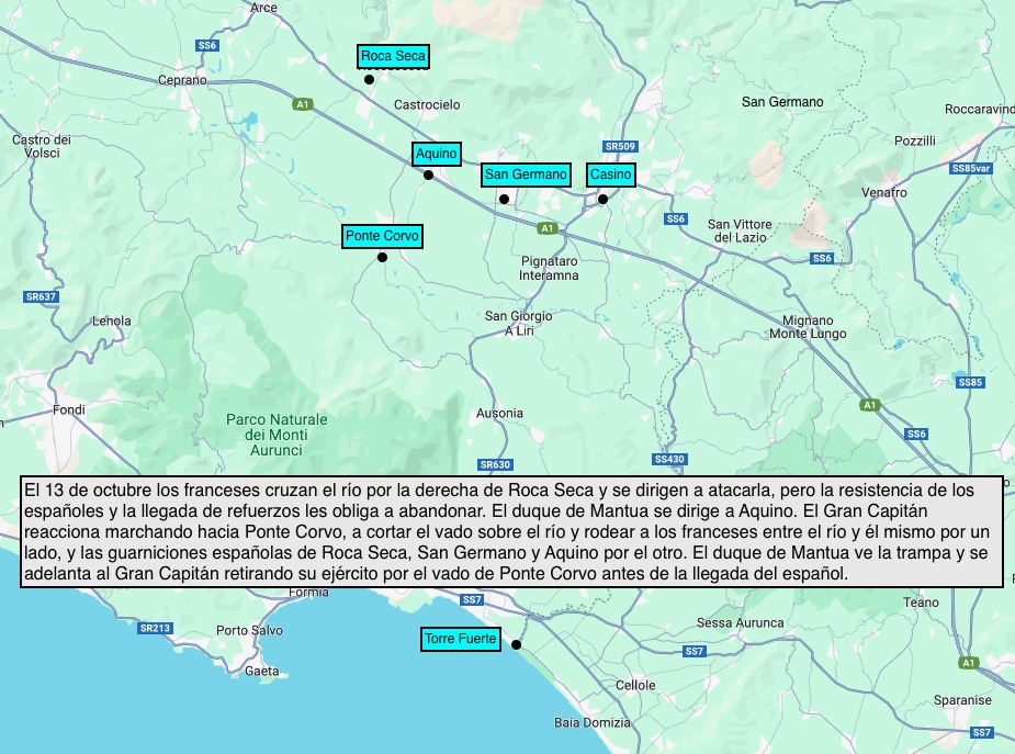 El 13 de octubre el ejército francés cruzó el rio Garellano por el vado de Ceprano, situado más allá del extremo derecho del dispositivo defensivo español. Una vez en la orilla izquierda, los franceses se dirigieron a atacar Roca Seca. El Gran Capitán envió en su socorro una columna de Infantería al mando de Pedro Navarro y Diego García de Paredes por caminos de montaña, mientras que por el llano envió a Próspero Colonna con la Caballería de los hombres de armas. En Roca Seca las tropas de Zamudio, Pizarro y Villalba resistieron y rechazaron los asaltos de los franceses, que se retiraron nada más aparecer por la montaña la Infantería española de refuerzo.