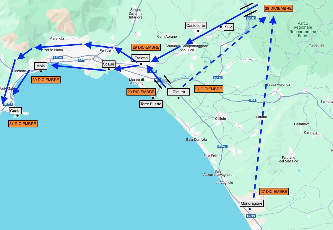 Juan López de Lazcano partió desde Mondragone hacia el punto de cruze, situado a unos 27 kilómetros, al este de Castelforte Suio y cerca de éstos. Transportaba los tres pontones despiezados y cargados en mulas. Al llegar al punto de cruce, comenzó a dirigir los trabajos de descarga de las piezas y montaje de los pontones sobre el río.