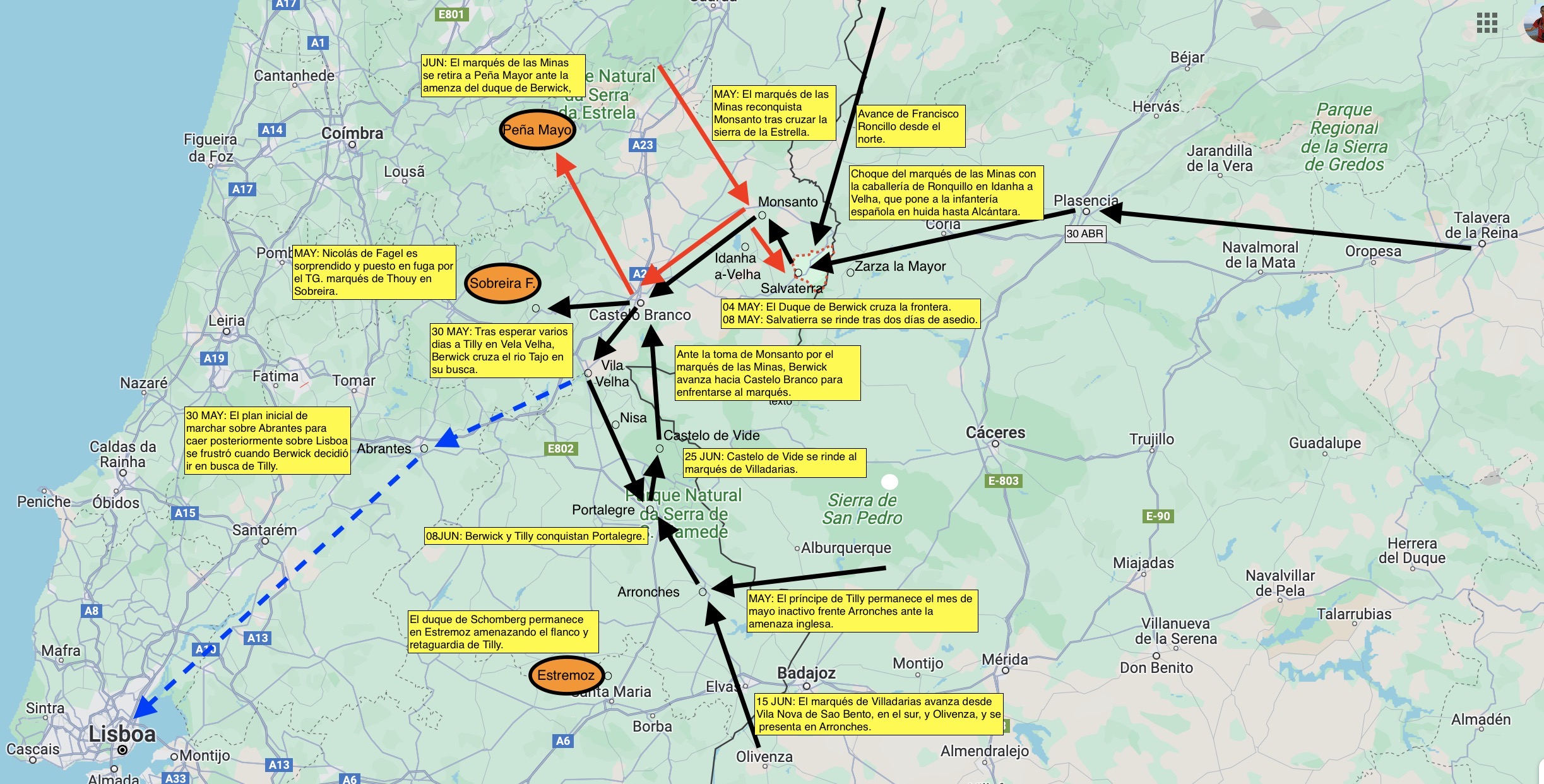 Berwick quería enfrentarse con el marqués Las Minas, y ordenó a Ronquillo que se reuniera con él. Mientras el marqués de las Minas avanzaba hacia Castelo Branco, Berwick llegó a este punto y acampó en sus cercanías con intención de atacar al portugués a día siguiente. Pero al enterarse de la fuerte presencia enemiga, el marqués se retiró hacia la Sierra de la Estrella, a una fuerte posición situada frente a Peña Mayor. Ante la imposibilidad de atacarle en aquel sitio, Berwick se retiró hacia Nisa, donde le esperaba el rey, dejando al mando de Iñigo de la Cruz Manrique de Lara Arellano y Mendoza, Grande de España y XI conde de Aguilar de Inestrillas.