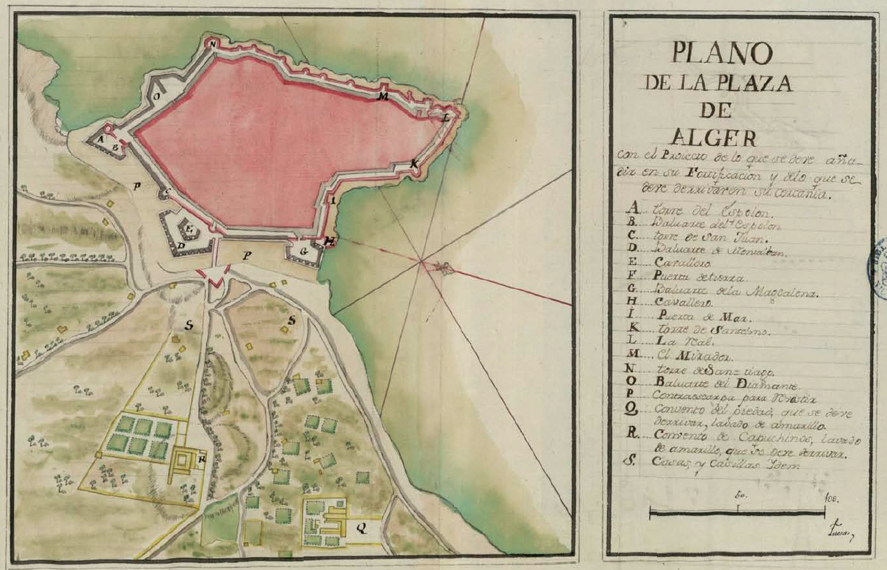 La plaza de Alger estaba edificada y cerrada con una muralla que daba al mar, excepto la parte que daba a tierra, que estaba defendida por tres baluartes y dos lienzos de ”muy buena muralla”: