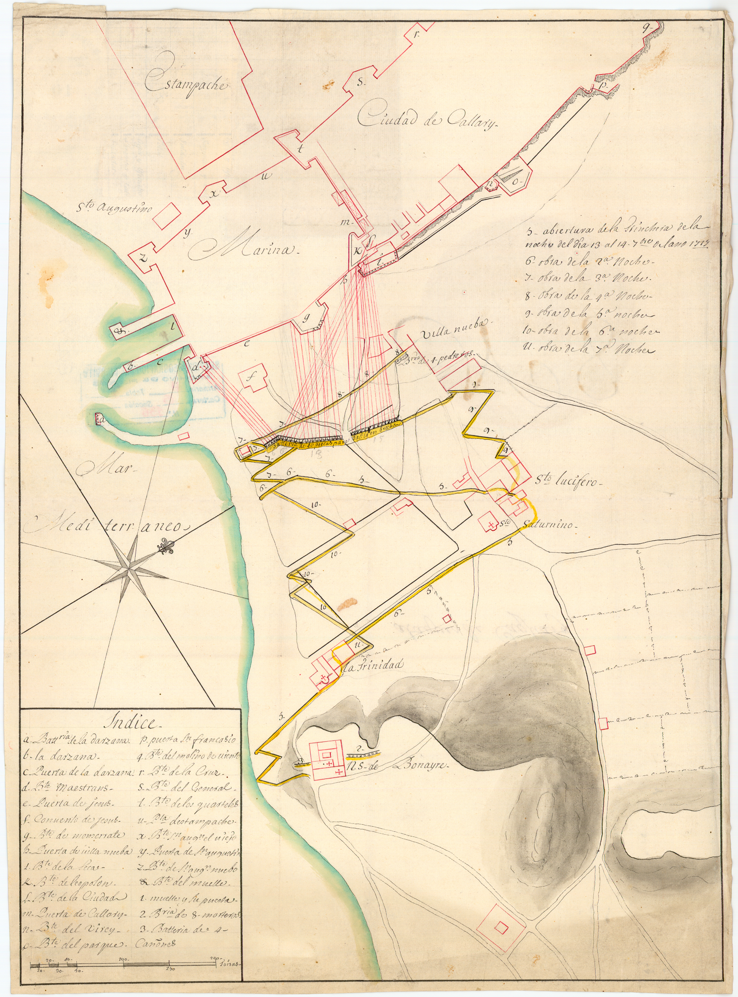 Emplazadas unas pocas piezas frente al arrabal de la Marina, sus fuegos posibilitaron la ocupación de éste por los españoles una noche, en que los defensores desalojaron el lugar y las tropas españolas se dispararon entre ellas debido a la confusión y la escasa coordinación del ataque. Acto seguido se comenzaron los trabajos para el emplazamiento dos baterías contra la plaza, una de 26 cañones y otra de 14 cañones, todos ellos de a 24, para disparar contra los baluartes del Español (o del Espolón) y de la Seca; y una tercera batería con 8 morteros para batir la plaza con objeto que los residentes solicitasen al virrey la rendición.