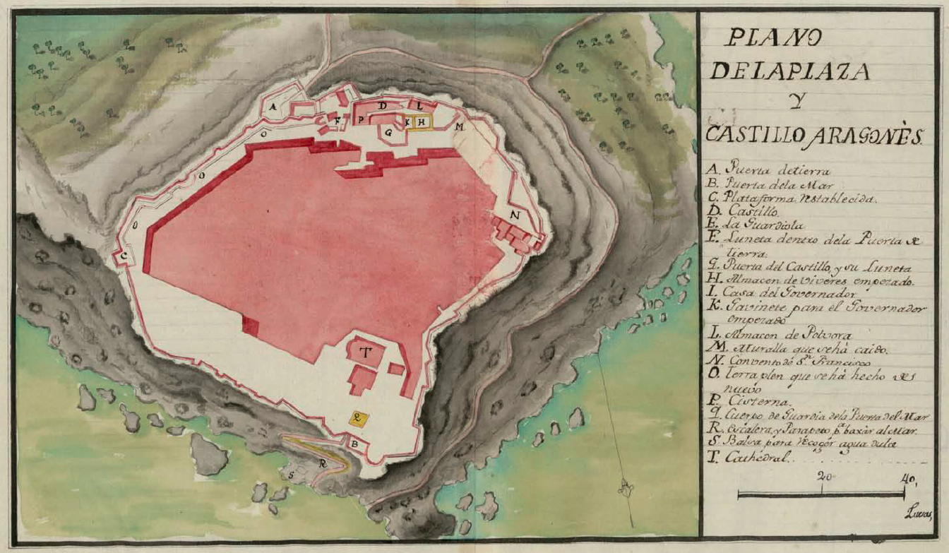 El castillo Aragonés era aparentemente una formidable fortaleza, edificada en roca viva que dificultaba el ataque cuesta arriba. Sus fortificaciones y baluartes eran antiguos, pero robustos; la extensión de su recinto amurallado era muy amplio por querer abarcar todo el área de la montaña donde estaba edificado el castillo, por lo que precisaba de una guarnición numerosa para su defensa. A pesar de ello, con víveres y munición suficiente, la guarnición podría haber resistido un asedio durante bastante tiempo.