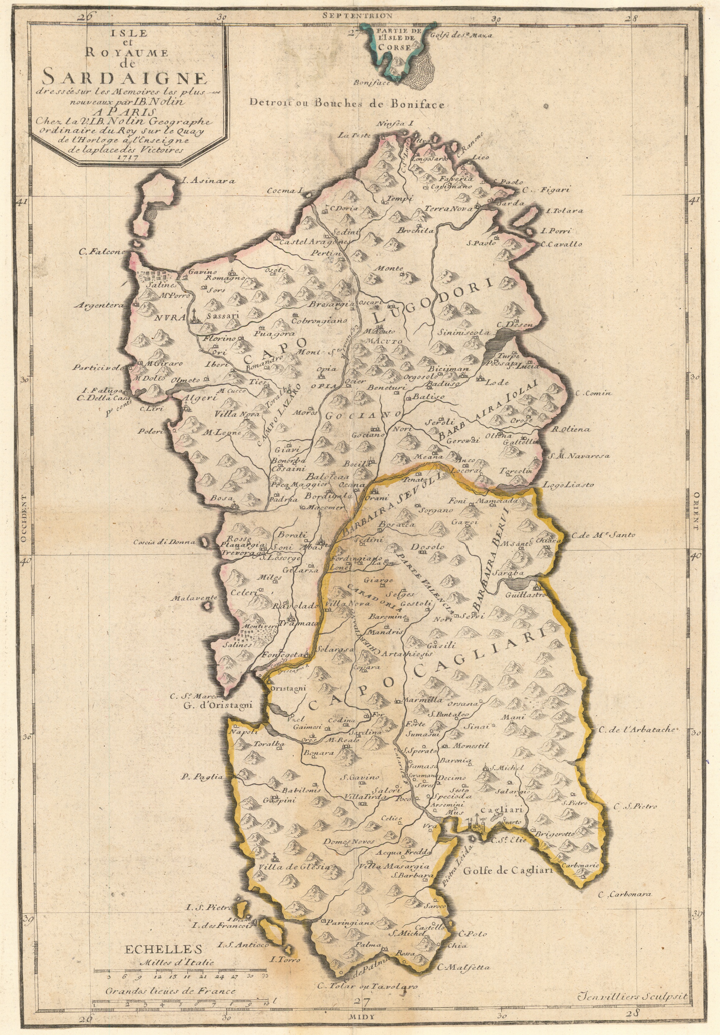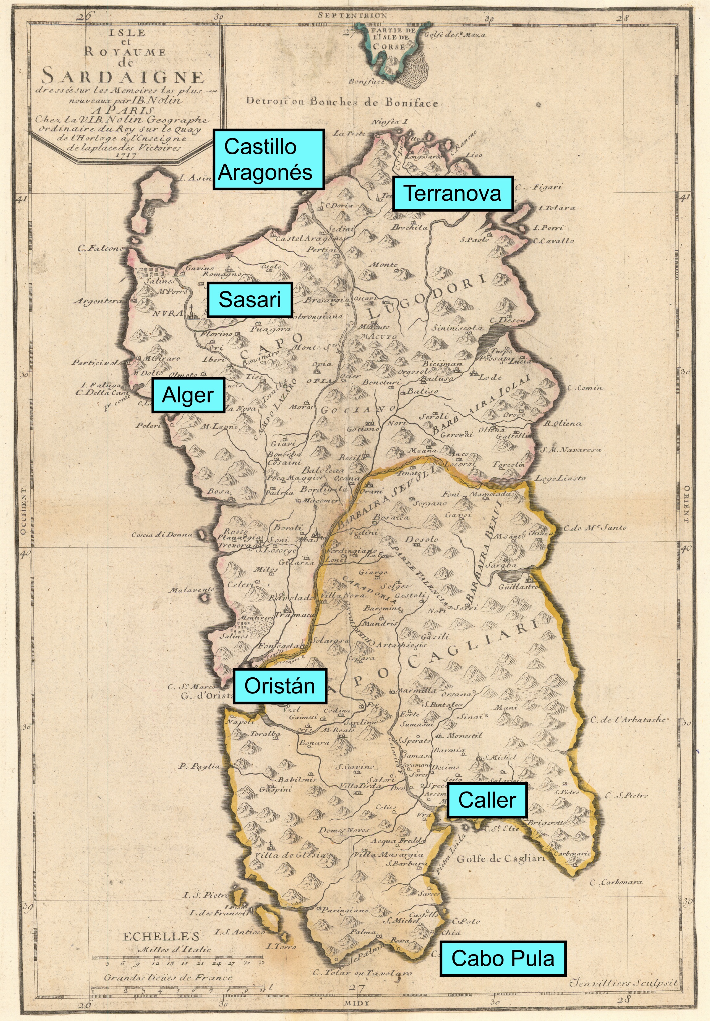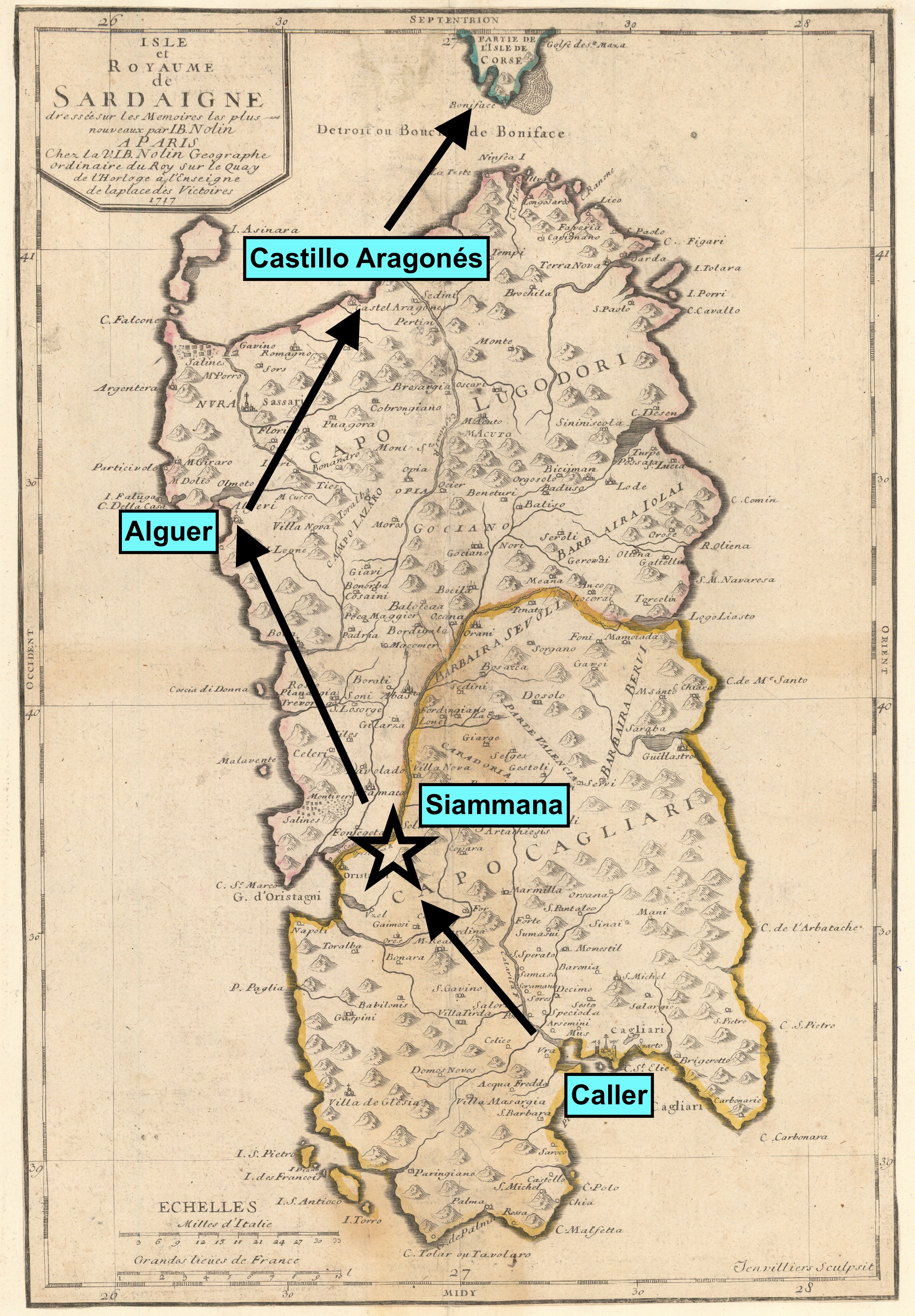 Durante la marcha, el marqués de Lede recibió la noticia de que un cuerpo de 900 soldados alemanes del Regimiento de Uvalles, al mando de un teniente coronel, había desembarcado en la localidad de Terranova (hoy Olvia), en la costa oriental de la isla, procedentes de Nápoles y transportadas por las galeras de aquel reino, al mando del conde de Fencalada, caballero español, quien inmediatamente regresó a Nápoles temeroso de enfrentarse a la escuadra española. Nada más desembarcar, los alemanes supieron de la huida del virrey y de la ausencia de tropas leales que les acogieran. Confusos, en territorio desconocido, sin saber exactamente el número de sus enemigos ni conocer el idioma y con pocos víveres, un grupo de unos 60 ó 70 sardos se les presentaron fingiéndose partidarios del emperador. Los sardos les guiaron de noche por las montañas hasta un lugar sin salida entre desfiladeros. Una vez allí, el jefe de los paisanos, don Juan Bautista Sardo, les obligó a rendir las armas y les tomó prisioneros, informando de ello enseguida al marqués de Lede.