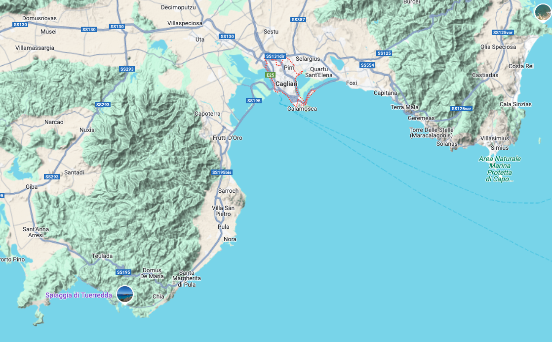 El 20 de agosto se juntaron ambas escuadras en el cabo Pula de Cerdeña, con la consiguiente alegría entre la tropa y los oficiales. Al día siguiente, 21 de agosto, las tropas desembarcaron en la larga playa de san Andrés, distante unos ocho kilómetros de la ciudad de Caller (hoy Cagliari), con muy poca o ninguna oposición, y marcharon por la estrecha lengua de tierra existente entre el mar a su izquierda y unas salinas a su derecha. La marcha fue dificultada por lo arenoso del terreno y la escasez de agua, hasta acampar cerca del santuario de Lluc, a un kilómetro largo de la plaza y al abrigo del monte Urpino, que le protegía del fuego de los cañones enemigos. Dos escuadrones de caballería enemiga observaron la marcha del ejército expedicionario español en todo momento, pero sin atreverse a enfrentarse a los dragones españoles.
