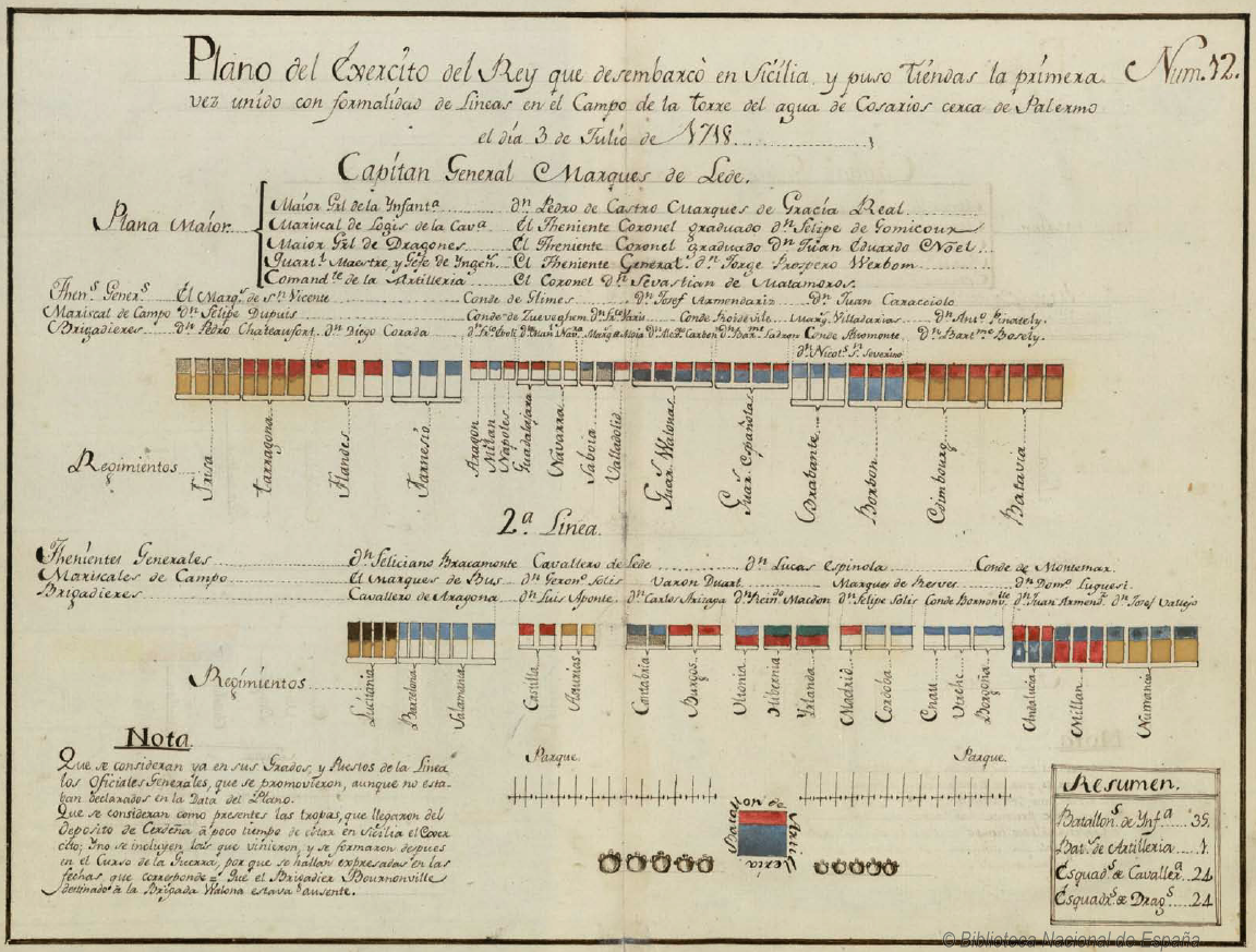 El teniente general Carrillo de Albornoz, conde de Montemar, fue nombrado gobernador de Palermo, teniendo al mariscal de campo marqués Dubus y al brigadier don Luis Aponte como subalternos.