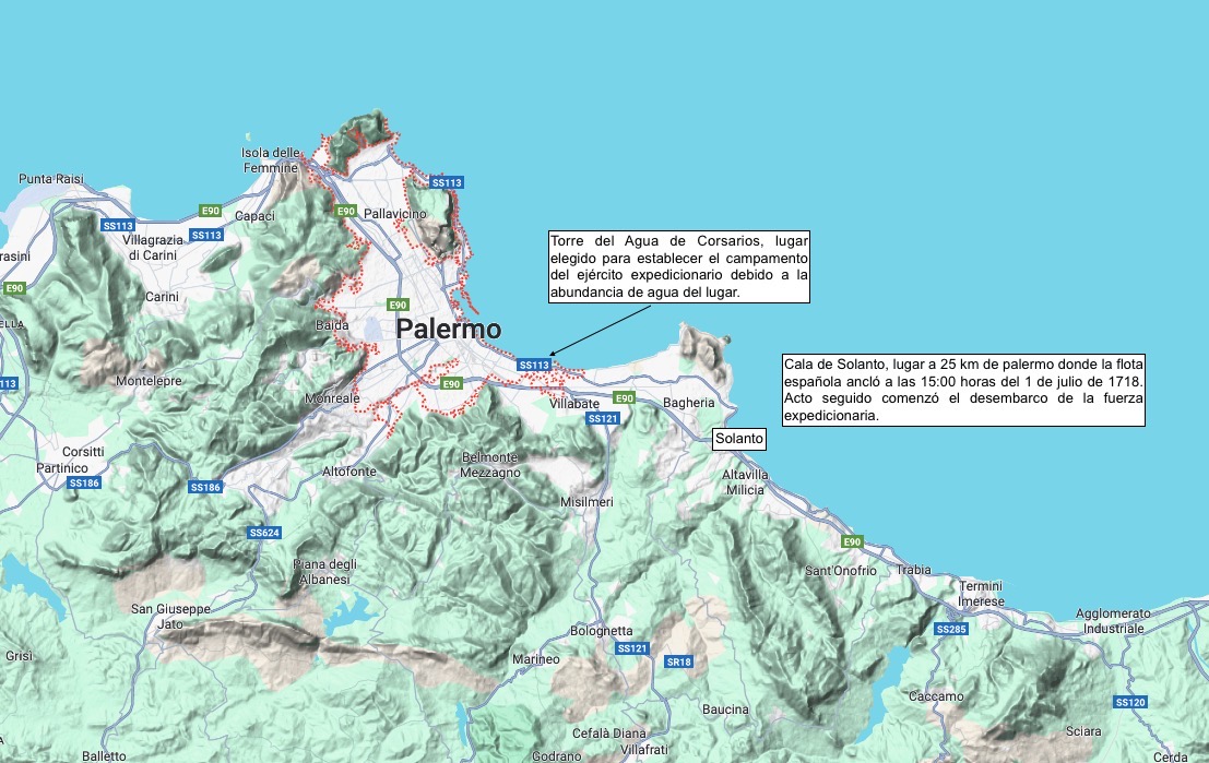 A las 15:00 horas del 1 de julio la flota ancló en la cala de Solanto, a unos 25 kilómetros al este de Palermo. Acto seguido comenzó el desembarco de la fuerza aprovechando la sorpresa y la ausencia de oposición, de forma que al anochecer ya había tropas españolas ocupando las alturas circundantes. Al finalizar el 2 de julio había desembarcado toda la Infantería y la Caballería, mientras un nutrido grupo de paisanos se acercaba al campamento español para darles la bienvenida y suministrarles víveres.