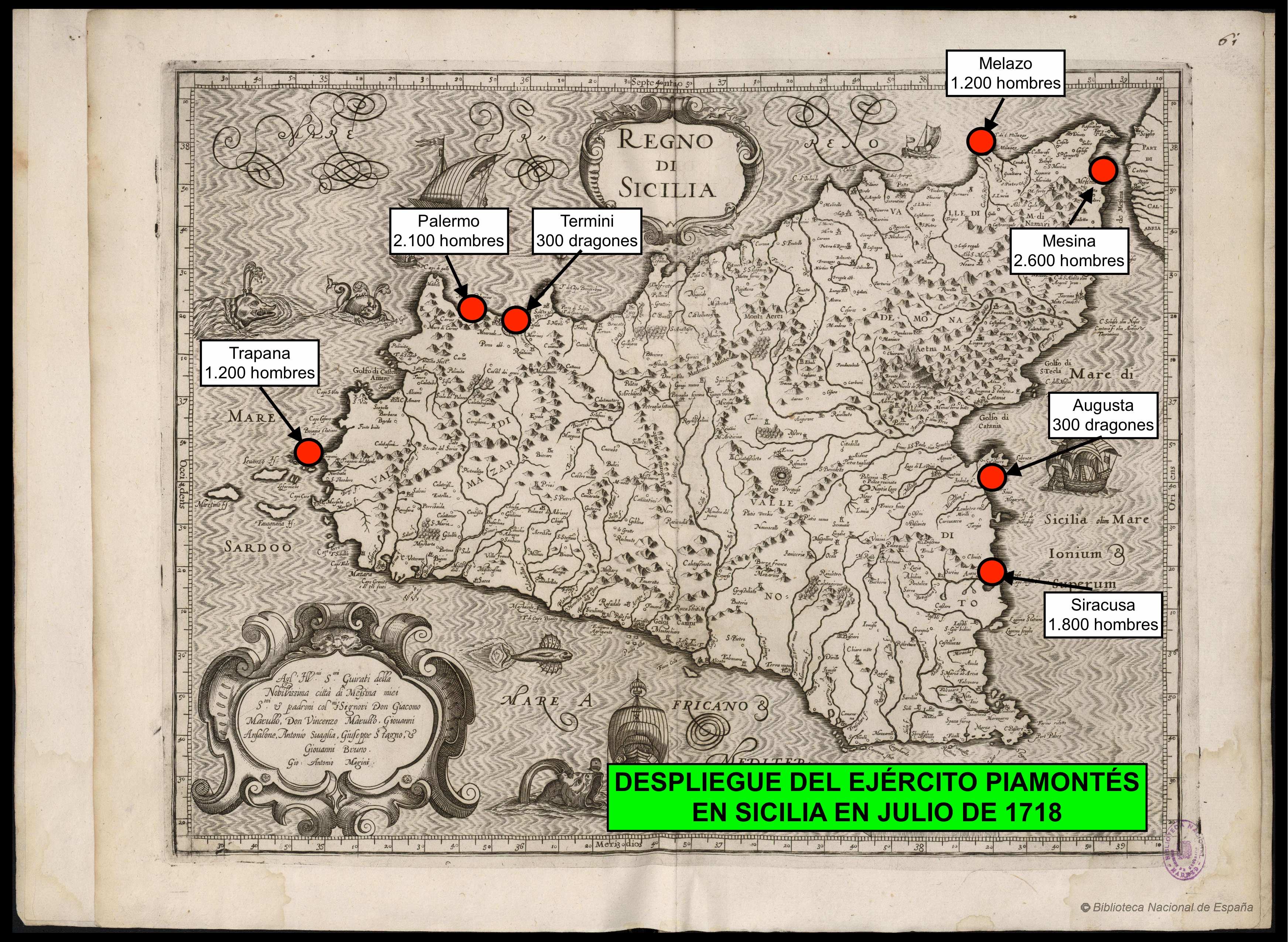 La guarnición que el duque de Saboya, rey de Sicilia, mantenía en la isla: 9.700 soldados encuadrados en catorde batallones de Infantería, un regimiento de Dragones y 400 artilleros repartidos en las plazas ocupadas.