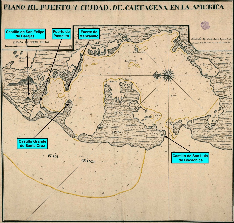 Tras forzar la entrada a la gran bahía interior de Cartagena de Indias, los británicos tardaron catorde días en acabar con las defensas interiores y acercarse a la plaza de Cartagena de Indias para dar el asalto final. Por la izquierda tomaron el castillo grande Santa Cruz e iniciaron el bombardeo de la ciudad. Por la derecha desembarcaron su ejército en las islas de Manzanillo y la Manga y los desplegaron en el cerro de la Popa, dispuesto a eliminar la última defensa que quedaba a la ciudad: el castillo de San Felipe de Barajas.