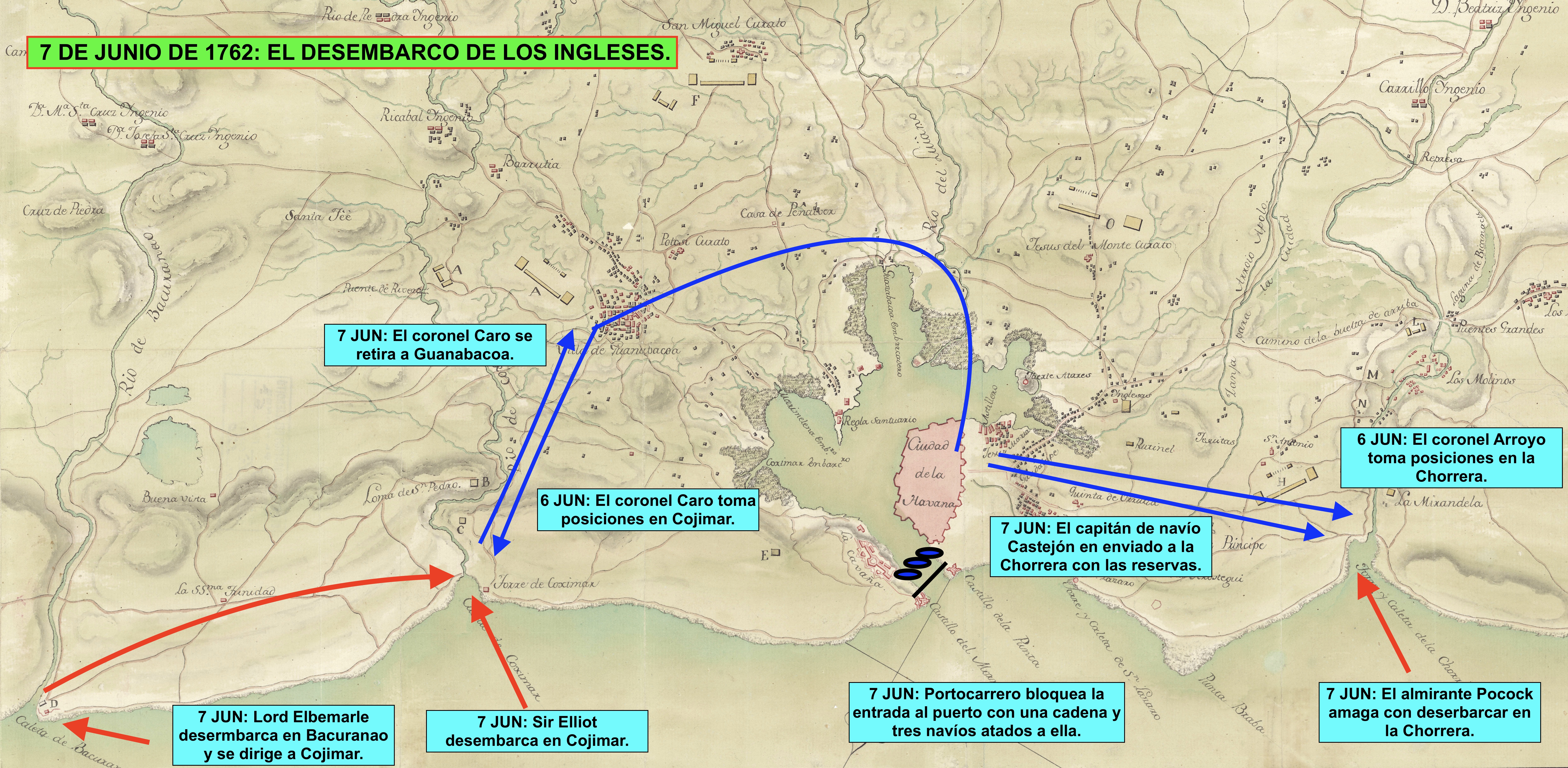 Los soldados ingleses, a bordo de lanchas de desembarco, esperaban impacientes el momento del saltar a tierra. Sobre las 14:00 horas el comodoro Keppel dio la orden de avance a las lanchas; en la playa de Cogimar desembarcó la primera brigada y la unidad del coronel Carleton, ambas fuerzas al mando de sir George Elliot, al tiempo que en la costa de Bacuranao lo hacía lord Albemarle con la mayor parte del resto de las tropas, para a continuación trasladarse a la playa de Cogimar, donde los ingleses pasaron la noche protegidos por piquetes y guardias avanzadas. Vista la superioridad numérica del enemigo y lo bisoño de sus fuerzas, el coronel Caro se retiró hacia Guanabacoa, en el interior, en dos columnas: una de infantería de línea y 150 dragones de Edimburgo; la otra de milicia y voluntarios.
