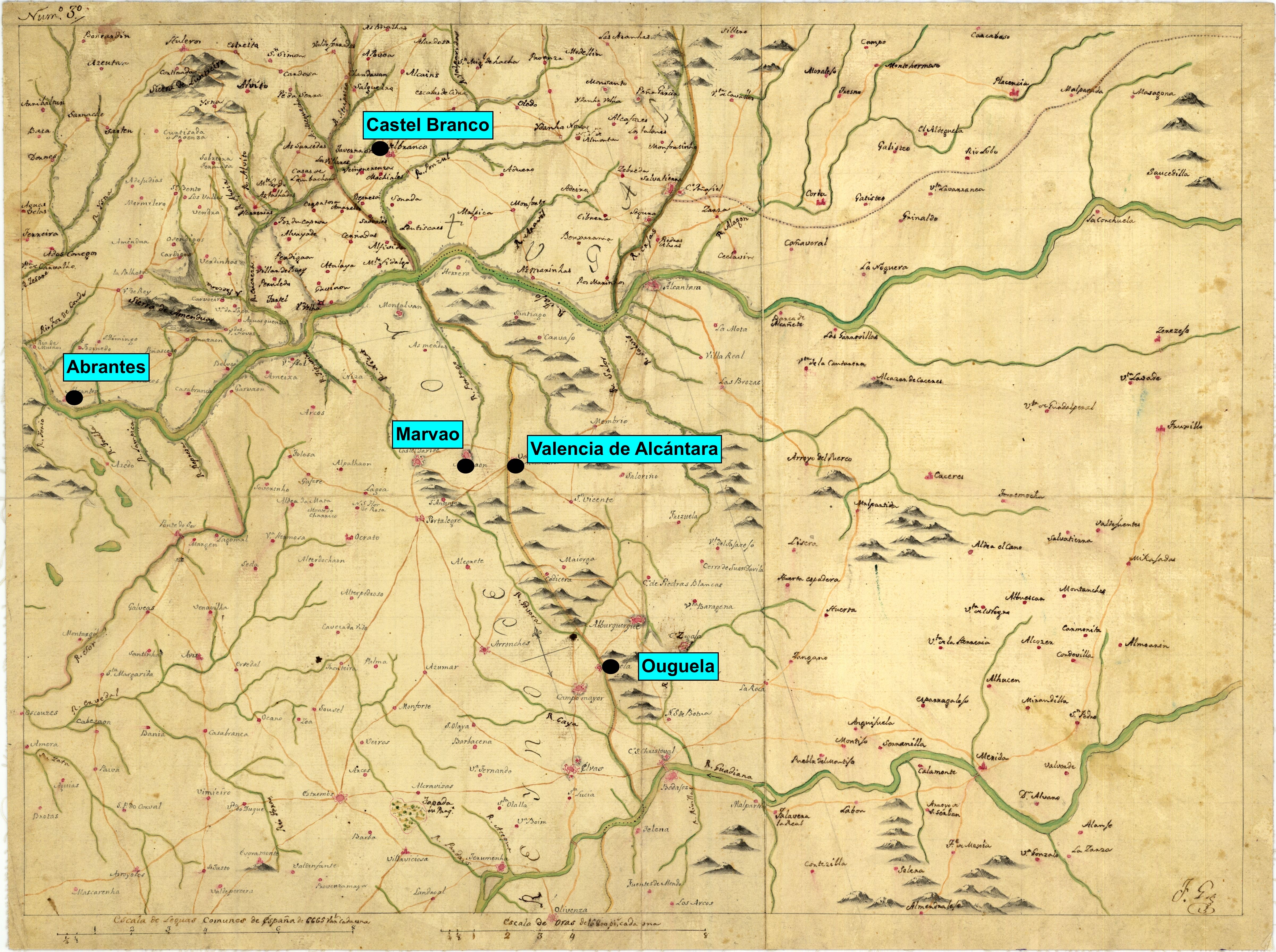 Un tercer ejército estaba concentrándose en la Valencia de Alcántara para penetrar en la provincia del Alentejo, pero el nuevo luso-británico atacó en esta frontera y penetró en territorio español. Los españoles reaccionaron expulsando al enemigo y entrando en Portugal, tomando las plazas fronterizas de Ouguela y Marvao, pero su avance fue detenidos en las montañas del este de Abrantes y lograron detener la invasión hispano-francesa. Mientras tanto, la guerrilla popular portuguesa seguía atacando a los soldados invasores. Un cuerpo portugués al mando del general británico Townshend hizo un movimiento para atacar la retaguardia española, obligando al ejército hispano-francés a retroceder hasta Castelo Branco. Finalmente, esta ciudad fue atacada por el ejército luso-británico y capturó un gran nñúmero de españoles heridos y enfermos que el conde de Aranda tuvo que dejar en la ciudad mientras se retirada con el resto de su ejército. Según fuentes británicas, los borbónicos perdieron unos 30.000 hombres por enfermedades, hambre, deserciones y muertes causadas por los guerrilleros campesinos portugueses[02]. En la persecución de los borbónicos, un cuerpo luso-portugués cruzó la frontera y entró en La Codosera, donde hizo varios prisioneros.