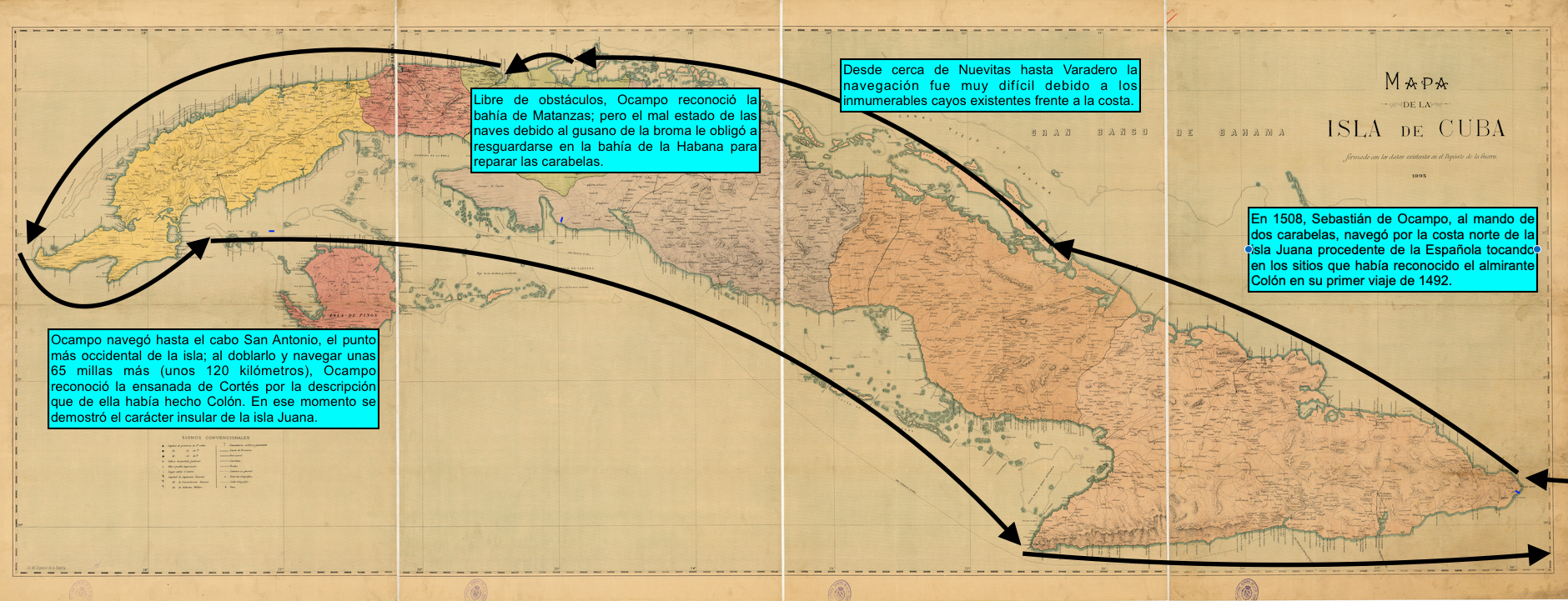 Reparadas las naves gracias a una fuente de asfalto natural que encontró en las cercanías, Ocampo siguió navegando hacia el oeste hasta llegar al punto más occidental de la isla, el actual cabo San Antonio. Al poco de iniciar la navegación con rumbo este llegó a la ensenada de Cortés, al sur de la isla, y reconoció el lugar por las descripciones realizadas por Colón, evidenciando que, como decían los indígenas, la isla Juana era, en efecto, una isla, y no parte del continente. Ocampo regresó a La Española por la costa sur de Cuba, parando en la bahía de Jagua y otros lugares, donde fue recibido con la misma amabilidad que lo fue el almirante. Finalmente llegó a la punta Maisí y de allí navegó hacia la Española, donde llegó tras un viaje de ocho meses y después de haber demostrado el carácter insular de Cuba[02].