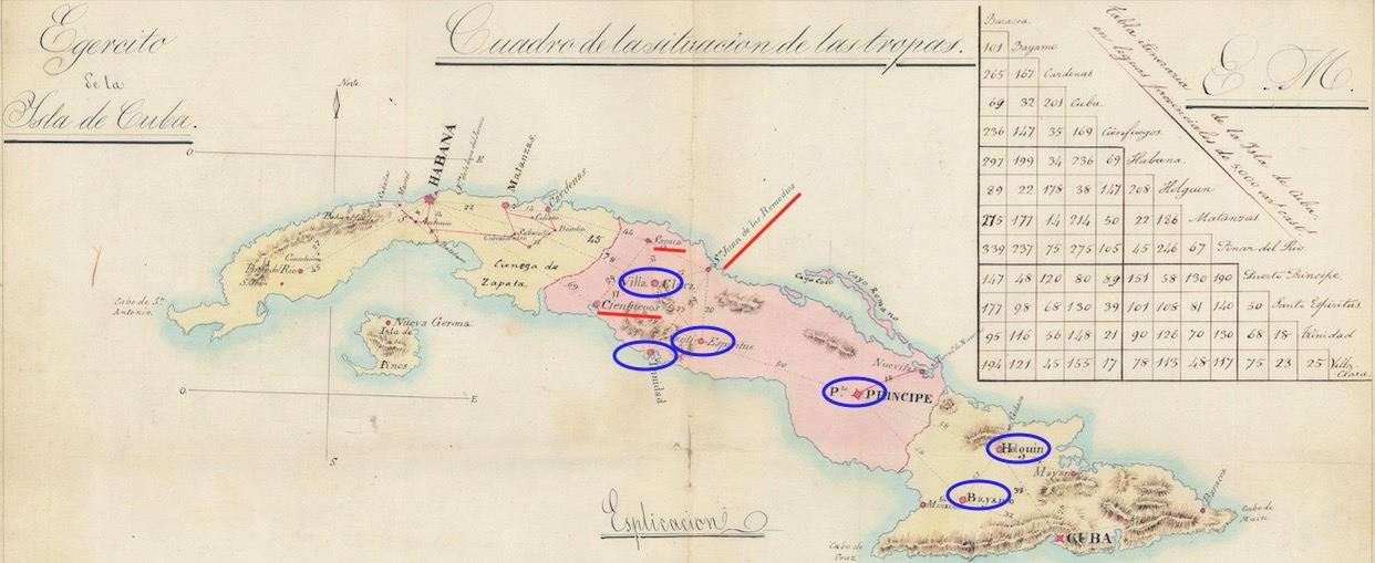 Lugares donde se hallaban las unidades citadas por el capitán general en su orden del 4 de mayo de 1850, con objeto de hacer frente a un posible desembarco filibustero en la costa sur de la isla de Cuba. Subrayado en rojo las tres localidades del sur y norte de lam isla en que también podrían desembarcar (Fuente: elaboración propia en un mapa que muestra la situación de las tropas en 1851, del informe del general de la Concha tras su toma de posesión como nuevo capitán general de Cuba. Ref: AGMM, caja 2542, carpeta 19.3, documento 1).