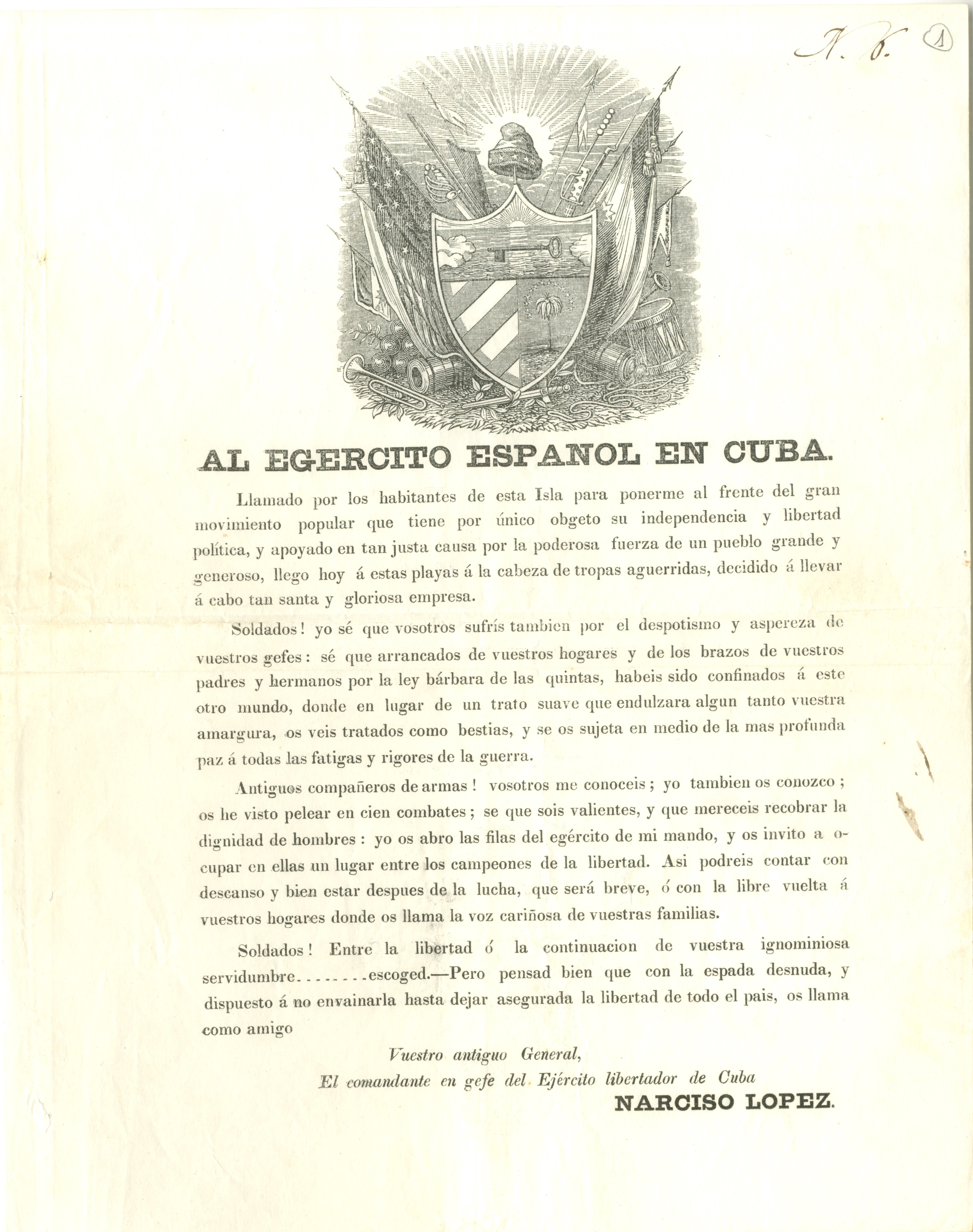 [09] Narciso López se incautó de 1492 pesos del gobernador, y de 1720 pesos de los fondos de obras públicas, a quien entregó el siguiente recibo: “Los 1720 pesos que resultan de esta cuenta pertenecientes al Gobierno despótico después de haberlos sacado a Cuba de la manera que acostumbran los tiranos, los he tomado yo para sostenimiento del Ejército libertador”.