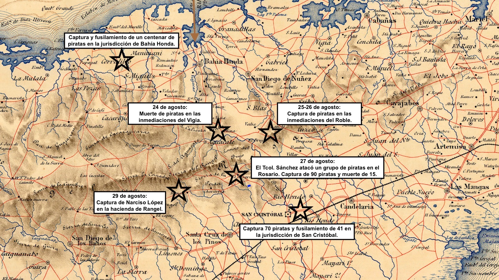 Los habitantes de la jurisdicción de Bahía Honda, que comprendía la sierra de Aguacate y las poblaciones de San Diego Núñez y Pozas, junto con los jinetes Rurales dejados por el coronel Morales y el destacamento de la jurisdicción, habían capturado y pasado por las armas un centenar de piratas.