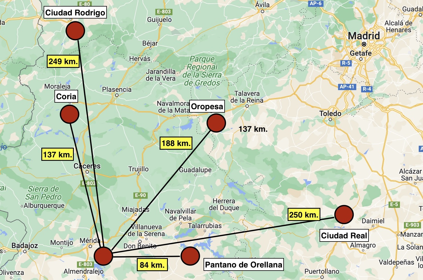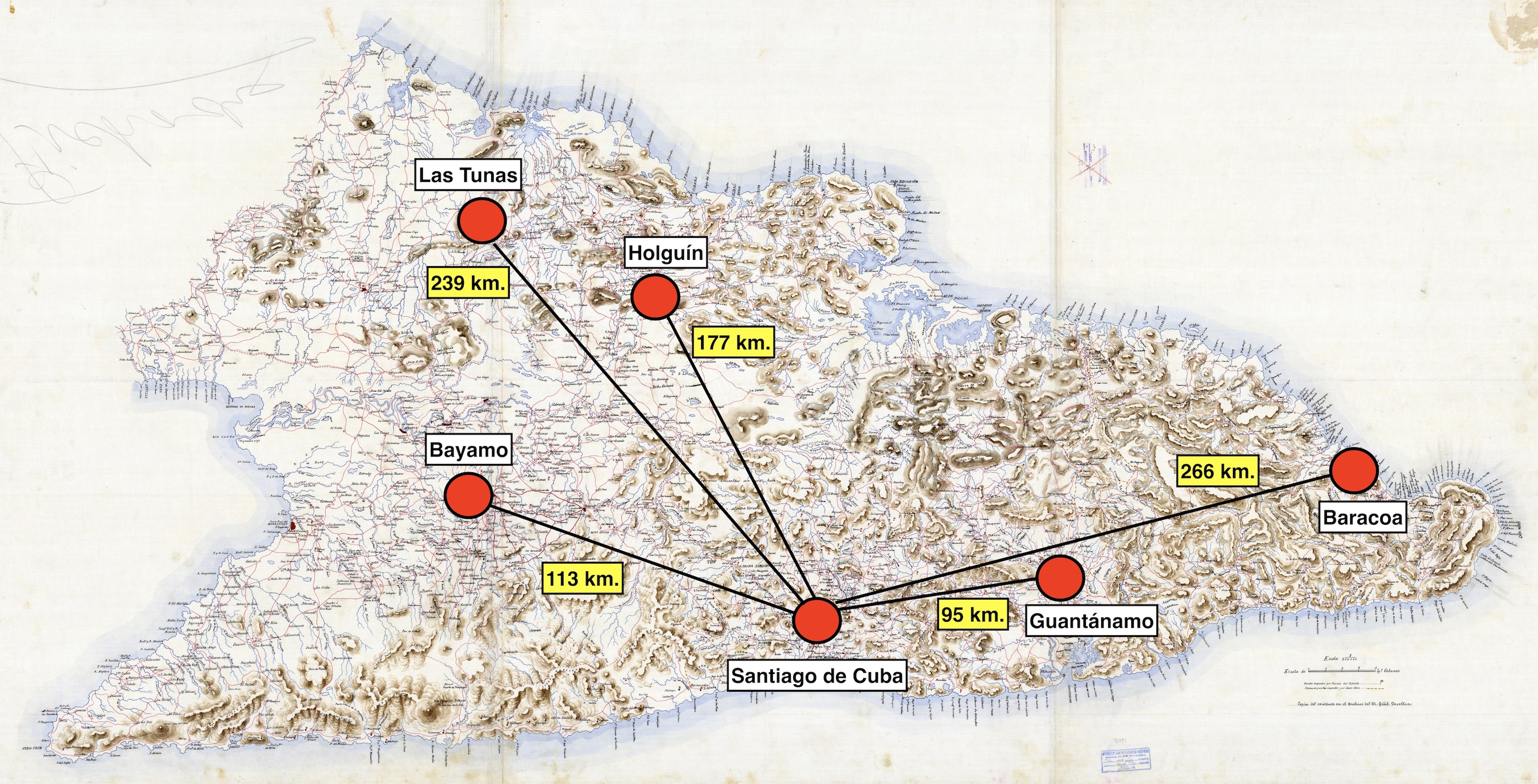Extremadura es un buen ejemplo para hacer una comparación con la provincia oriental de Cuba, pues tiene una superficie de 41.635 km2, similar a esta provincia cubana. Hemos elegido una serie de ciudades y localidades en ella (y fuera de ella) para tratar de hacernos una idea de las distancias en las que estaban desplegados los destacamentos y las que tenían que recorrer. De esta manera, asimilando Mérida con Santiago de Cuba encontramos las siguientes similitudes: