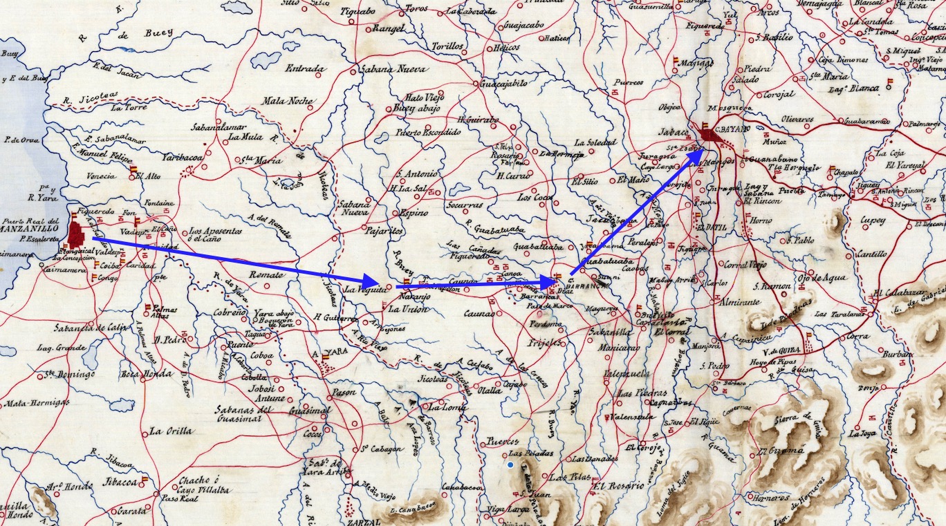 El coronel Fidel Alonso de Santocildes había salido de la Habana al mando de un batallón del regimiento de Infantería Isabel la Católica núm. 75 para reforzar las tropas del general Lachambre en la provincia de Santiago de Cuba. Tras embarcar en Batanabó en un vapor correo de la Compañía de Menéndez que hacía la travesía por la costa sur de la isla, desembarcó en Manzanillo, donde dejó unos 400 soldados con intención de partir con el resto por tierra hacia Santiago de Cuba, para incorporarse a las operaciones que se le encomendaran.