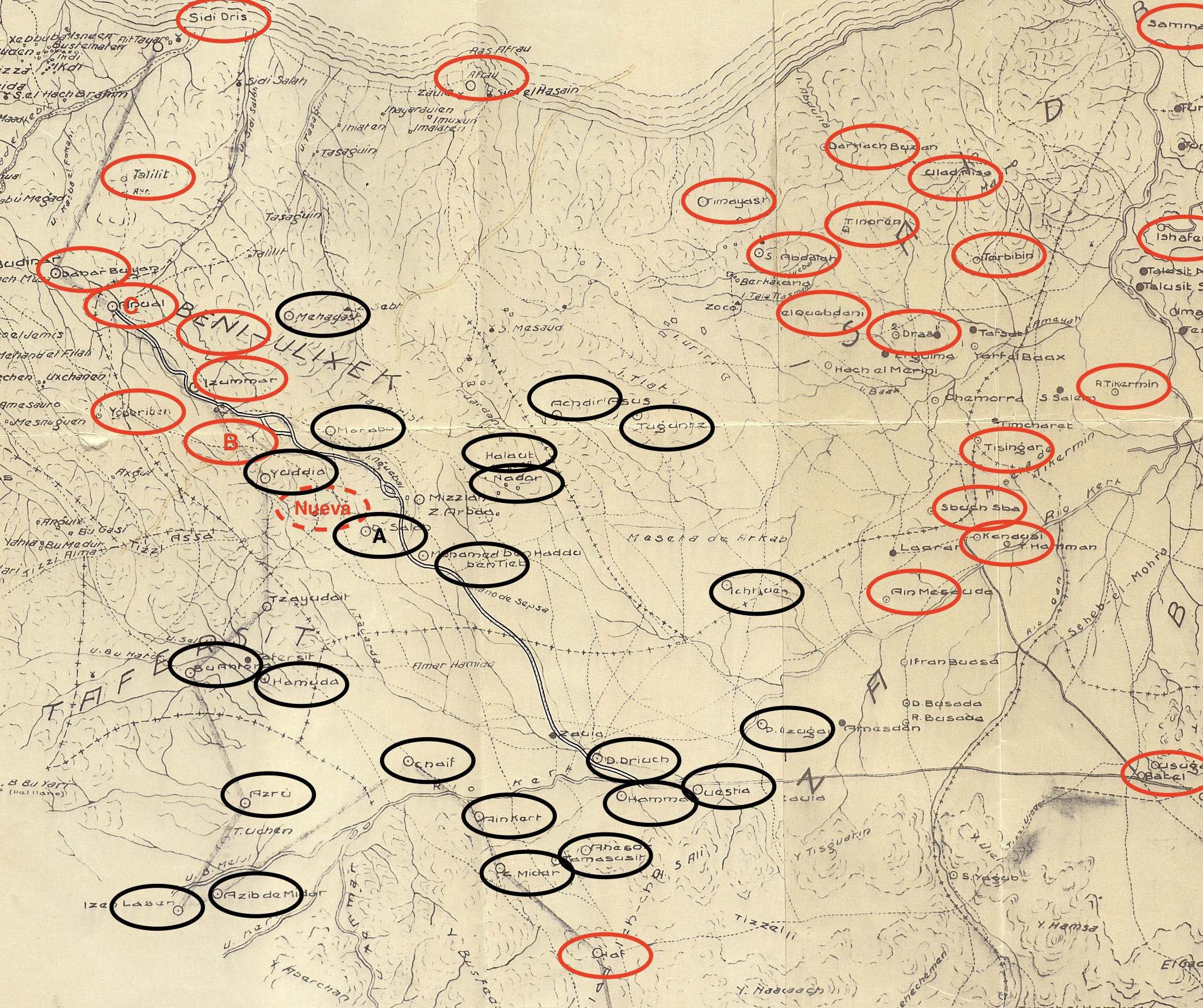 2. Mehayast 3. Morabo de Sidi Mohamed 4. Yebel Uddia 5. Intermedia A 6. Ben Tieb (posición, campamento y columna) 7. Yemaá de Nador (Nador de Beni Ulikek) 8. Halaut 9. Axdir Asus 10. Tuguntz |