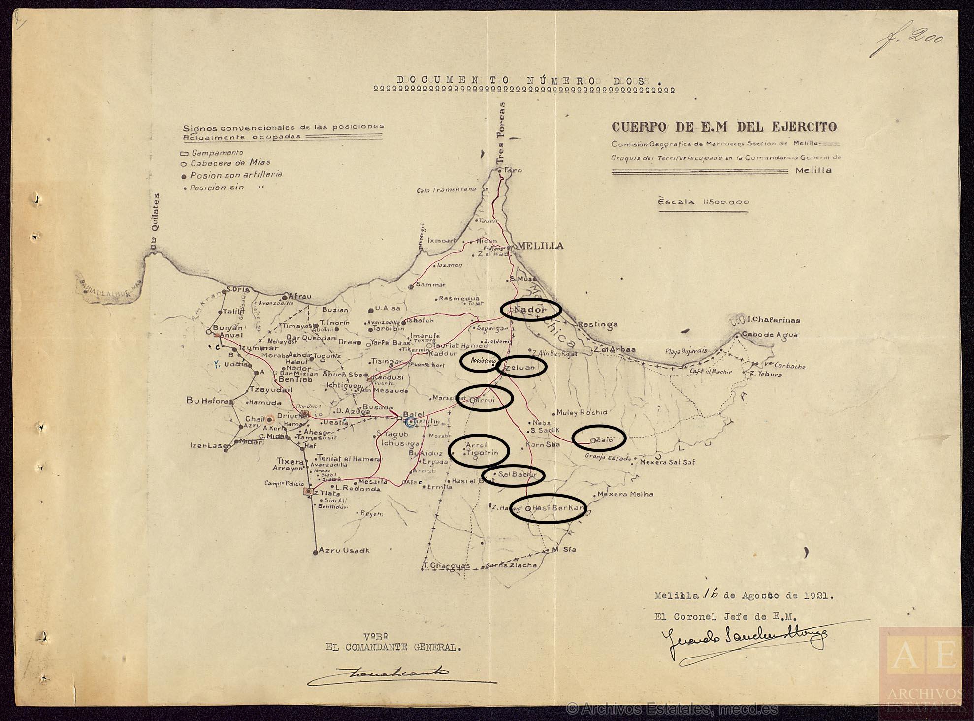 DOCUMENTO: Estadillo de las posiciones de la circunscripción de Nador, correspondiente al 22 de julio de 1921 (AHN. TS-R. Expediente 50.2. Folios 348 a 357).