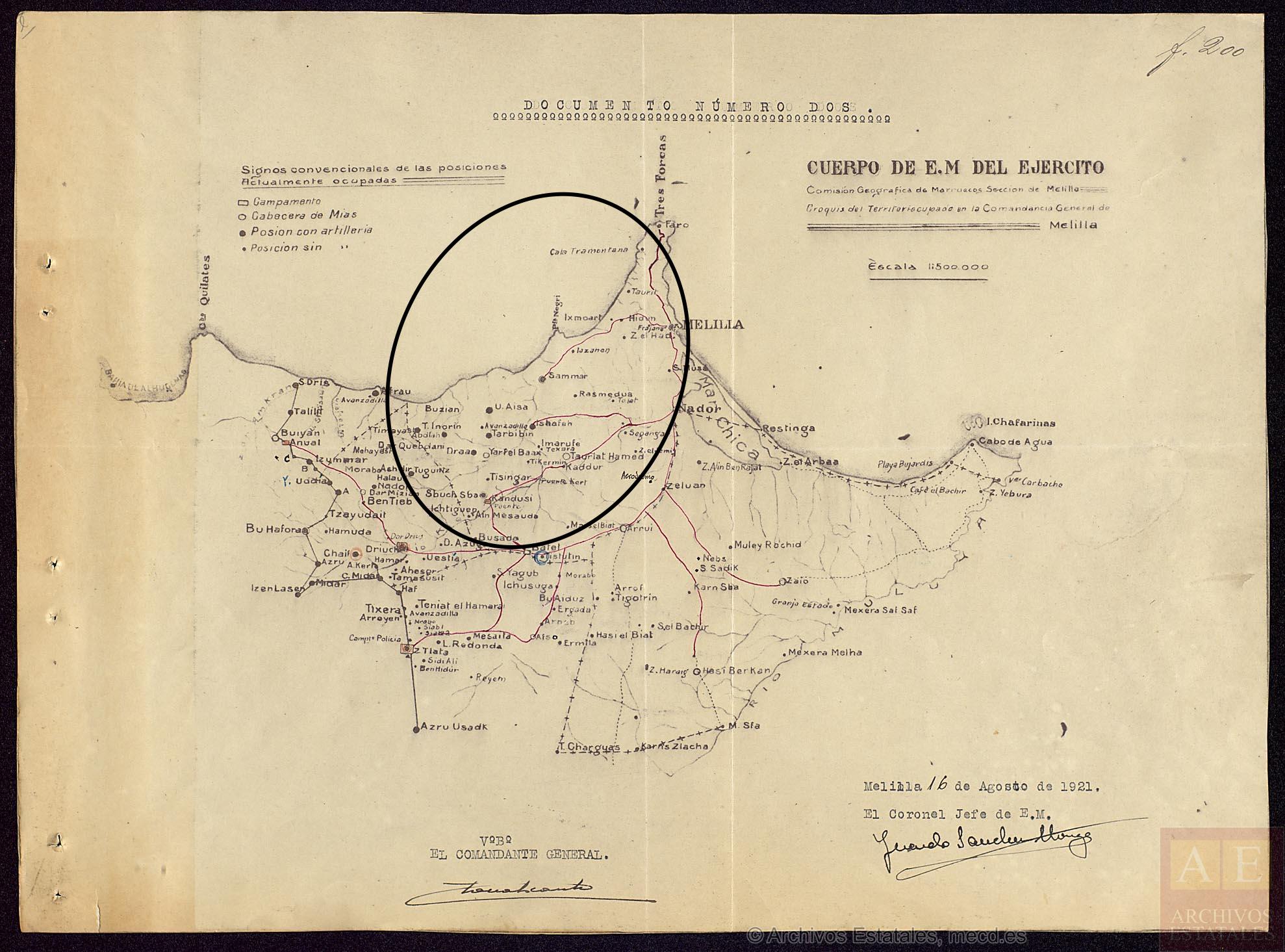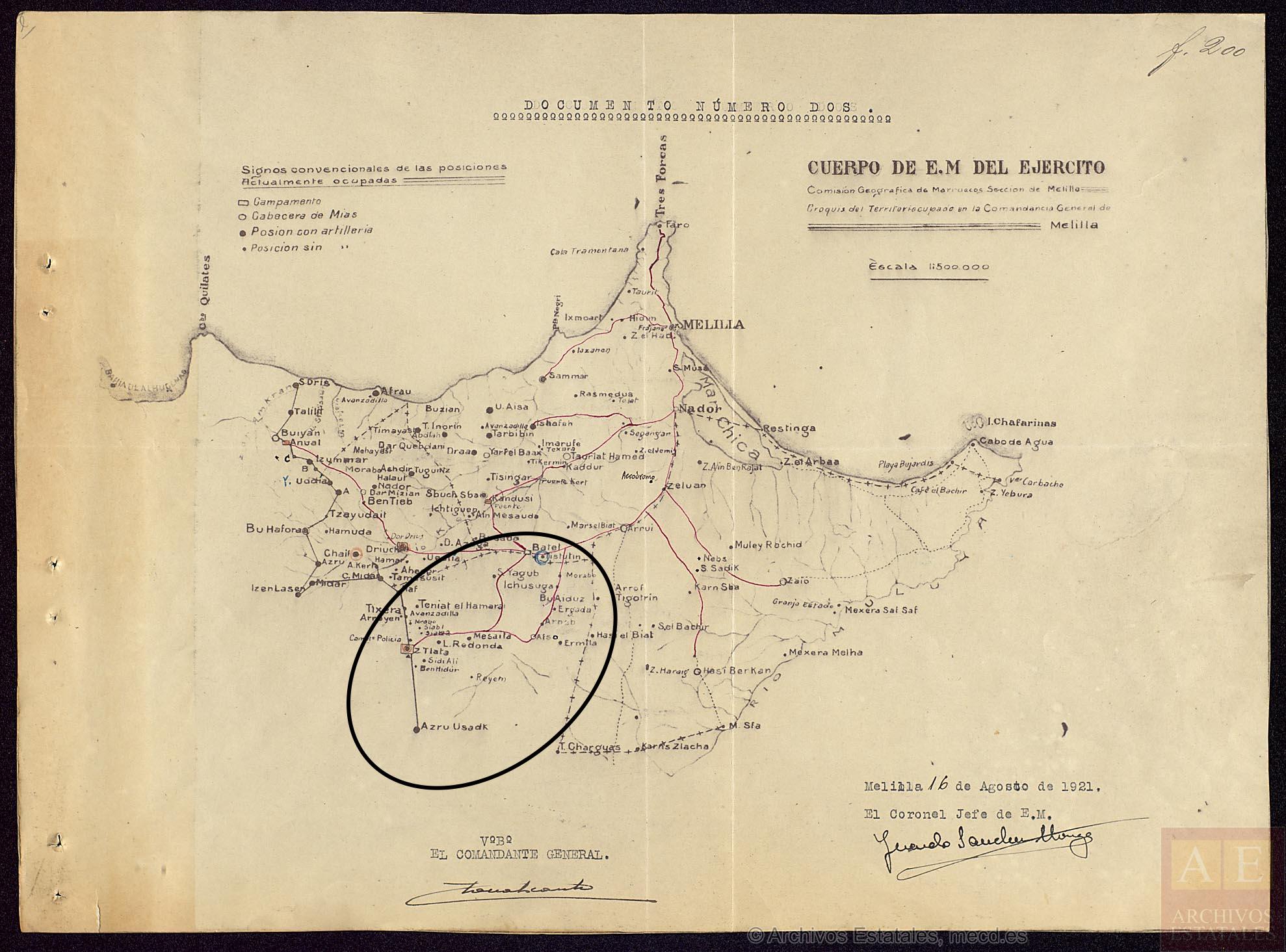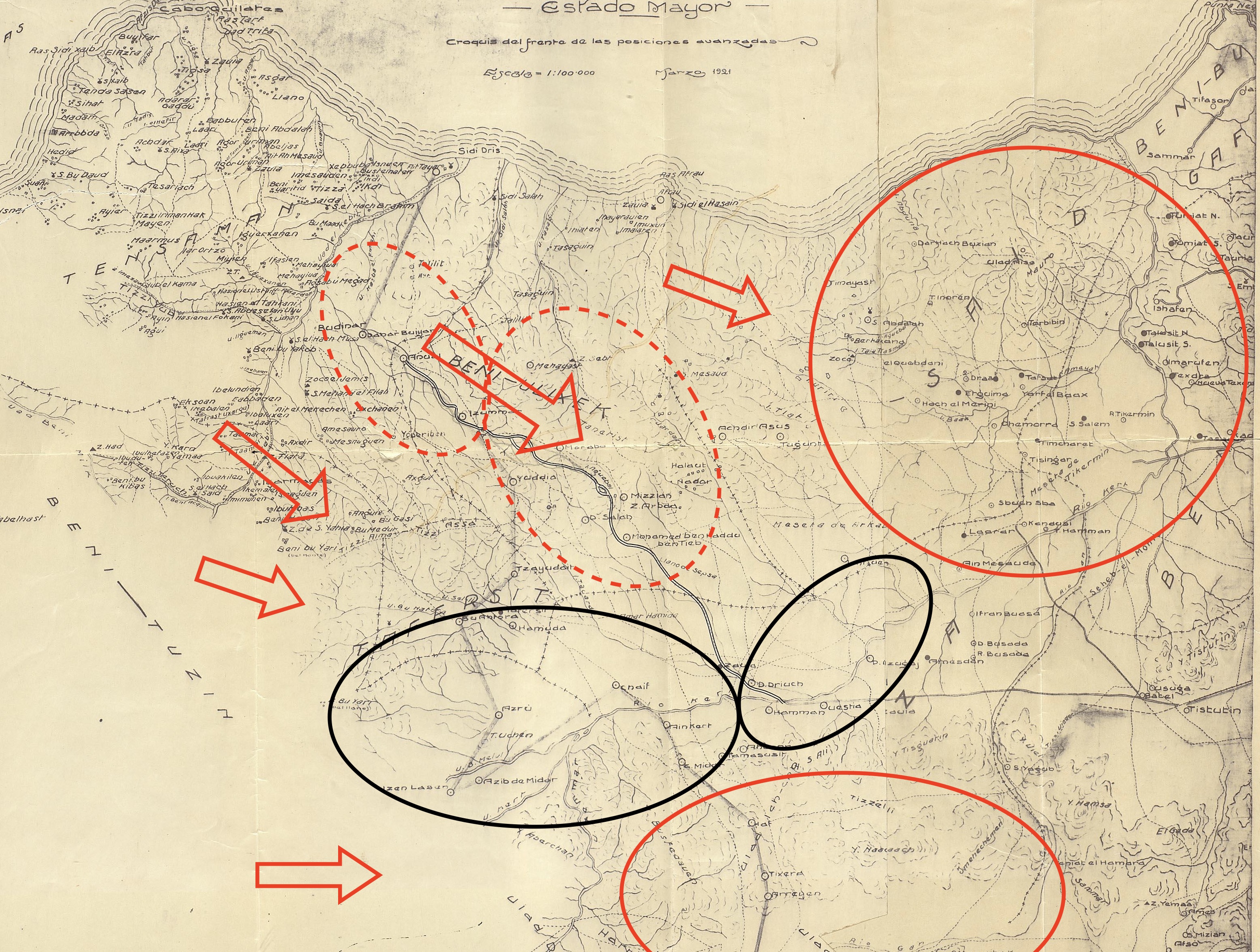 "Aunque con ello se comprometa éxito campaña sobre Beni Arós, que ahora se hallaba en una de sus fases más interesantes, enviaré a V.E. dos banderas del Tercio y sus dos compañías de ametralladoras con su Teniente Coronel, dos tabores Regulares de Ceuta con su compañía de ametralladoras y su Teniente Coronel, una batería de montaña y una ambulancia; para estas fuerzas llevará tiendas individuales, y probablemente irá con ellas el general Sanjurjo."