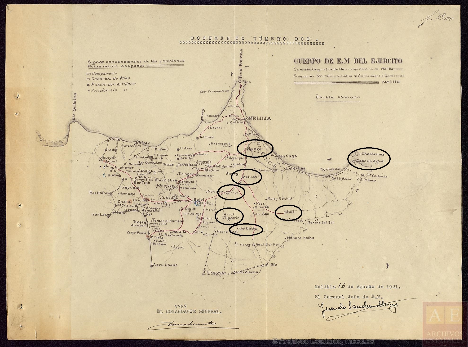 La circunscripción de Nador era la que estaba más al este de la Zona Oriental del Protectorado. El levantamiento de las cábilas no había arraigado en aquel territorio excepto en las áreas ligadas a la principal línea de comunicaciones, jalonadas por tres posiciones ubicadas en las proximidades de sendos poblados: