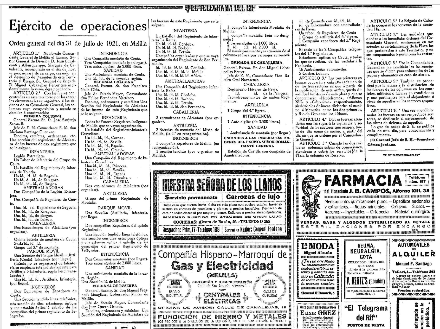 Ese día llegó el general de División don José Cavalcanti para tomar posesión de su cargo de Comandante General de Melilla. Para entonces ya había concentradas en Melilla las siguientes unidades: