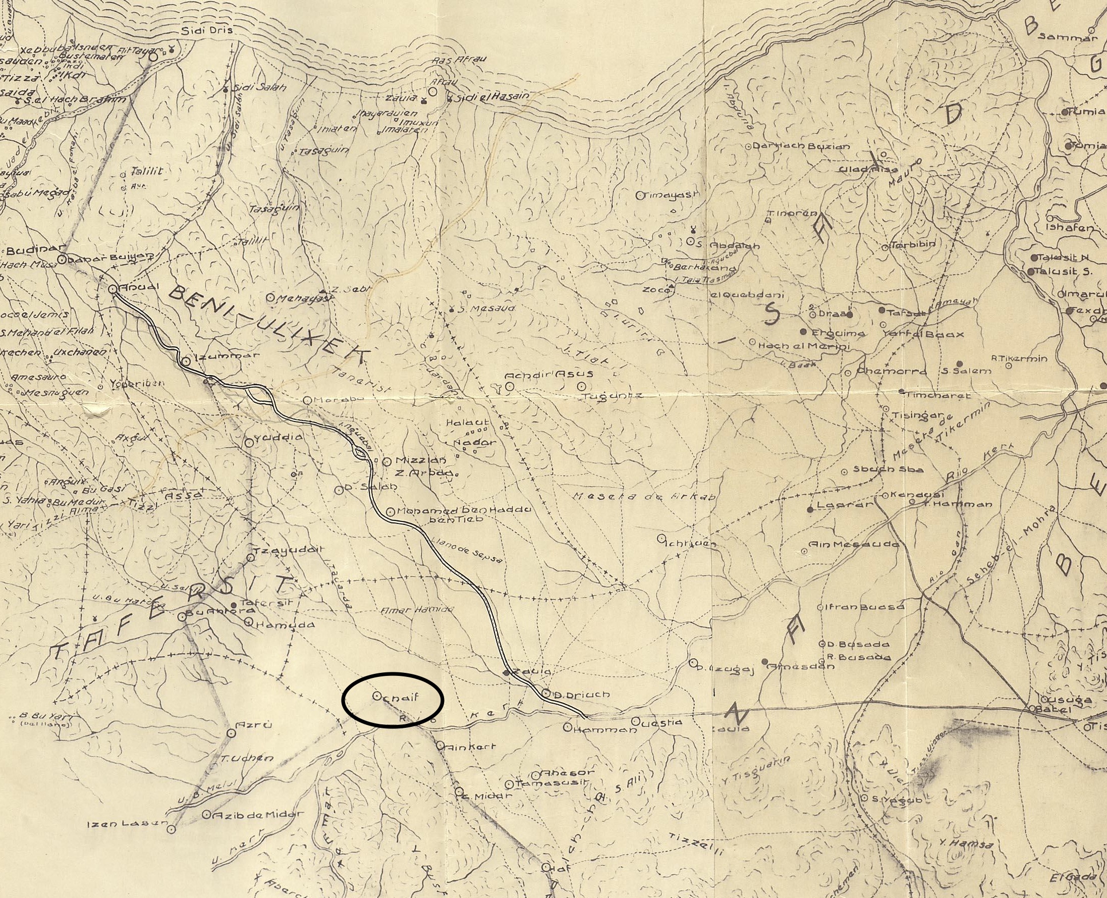 La posición de Cheif, asentada en la avenida de la cábila de Beni-Tuzin, en el llamado boquete de Midar, sobre la margen izquierda y a unos tres kilómetros del río Kert, constituida esencialmente por unas casas moras puestas en somero estado de defensa, careciendo de alambrada y otros reparos, y cuya descripción se hace al folio 1491.