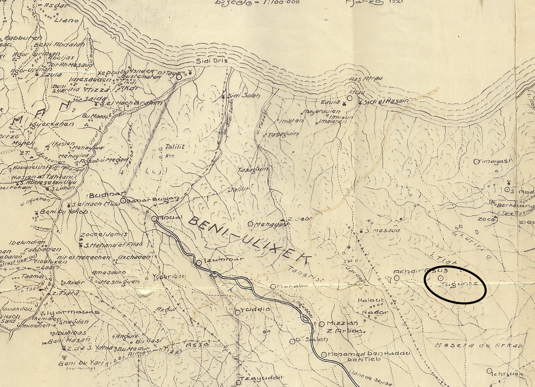 No he localizado aún esta posición, pero la situo en algún punto al sureste o alrededores de Axdir Asus por estar esta última defendida por una sección de la misma compañía que defendía Tuguntz, en la inteligencia de que no deberían estar demasiado lejos ambas posiciones ya que, tras haber asaltado Axdir Asus, el enemigo se dirigió a Tuguntz.