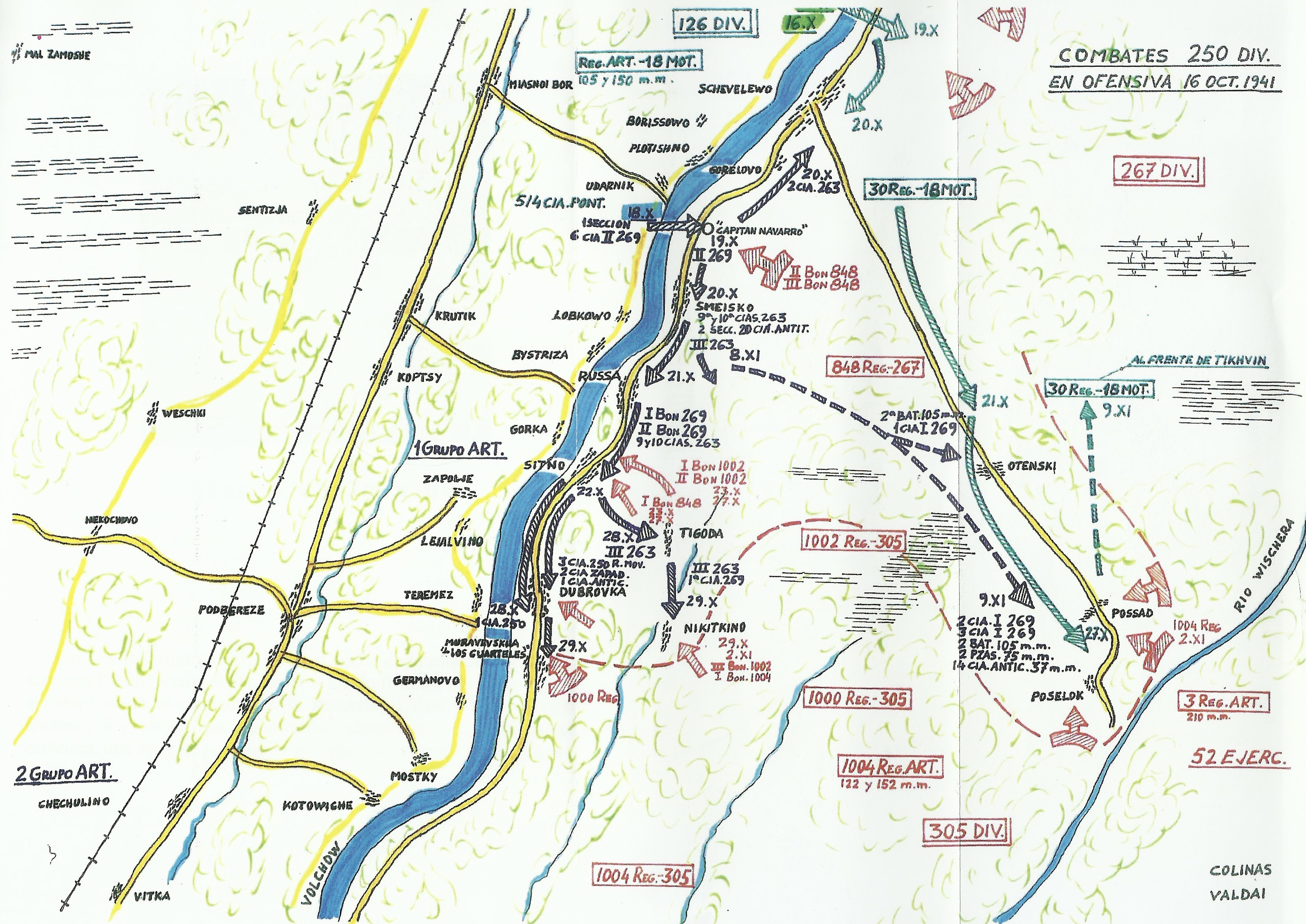 La ofensiva soviética de sus ejércitos 4º y 54º sobre Tikhvin había hecho retroceder el frente alemán, incluida la 126ª División desplegada al norte de la División Azul, por lo que el mando alemán decidió establecer un frente defensivo sobre el río Volchov. Para ello la división española debía regresar a sus posiciones de partida en octubre.