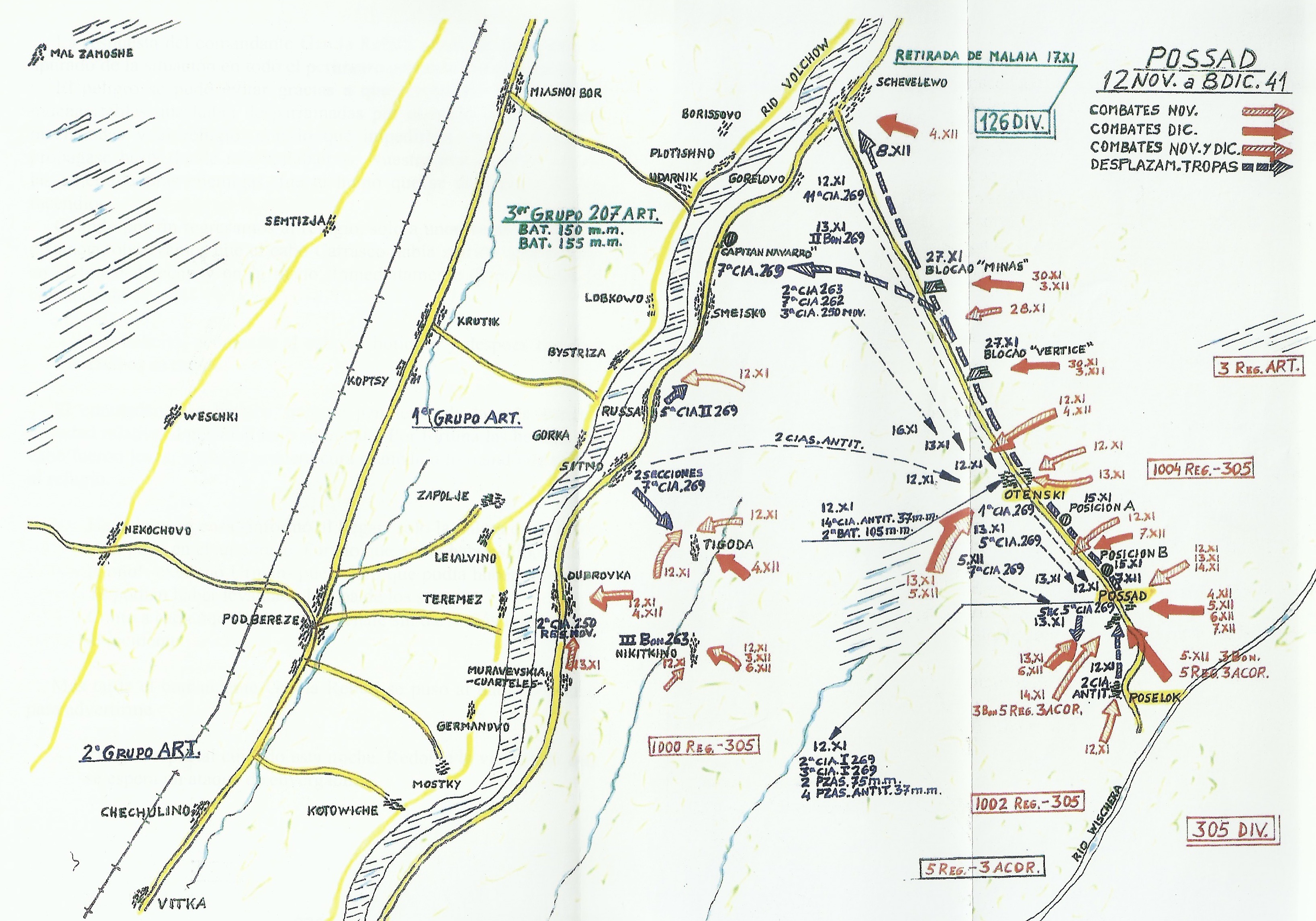 Más al norte, la ofensiva alemana había logrado alcanzar el nudo de comunicaciones de Tikhvin, con fuerzas de la 12ª División Panzer y la 18ª División Motorizada y apoyo de la Luftwafe. Por ello, el 30º Regimiento alemán que ocupaba Possad recibió órdenes de rertirarse de la localidad para incorporarse a la lucha en el sector de su división, y que hiciera el relevo con una unidad de la División Azul. Por ello, el 1 de noviembre dos compañías de Batallón I/269, con cuatro piezas antitanque de 37 mm y dos piezas de 75 mm, al mando del comandante Luque Molinello, se desplazó para ocupar Otenski y su monasterio, donde quedó el capitán Vallespín, Possad y la posición adelantada de Posselok. Desde Otenski partía una carretera hacia Schevelevo, a diez kilómetros, para el aprovisionamiento, que discurría entre bosques y era frecuentemente minada y hostigada por los rusos.