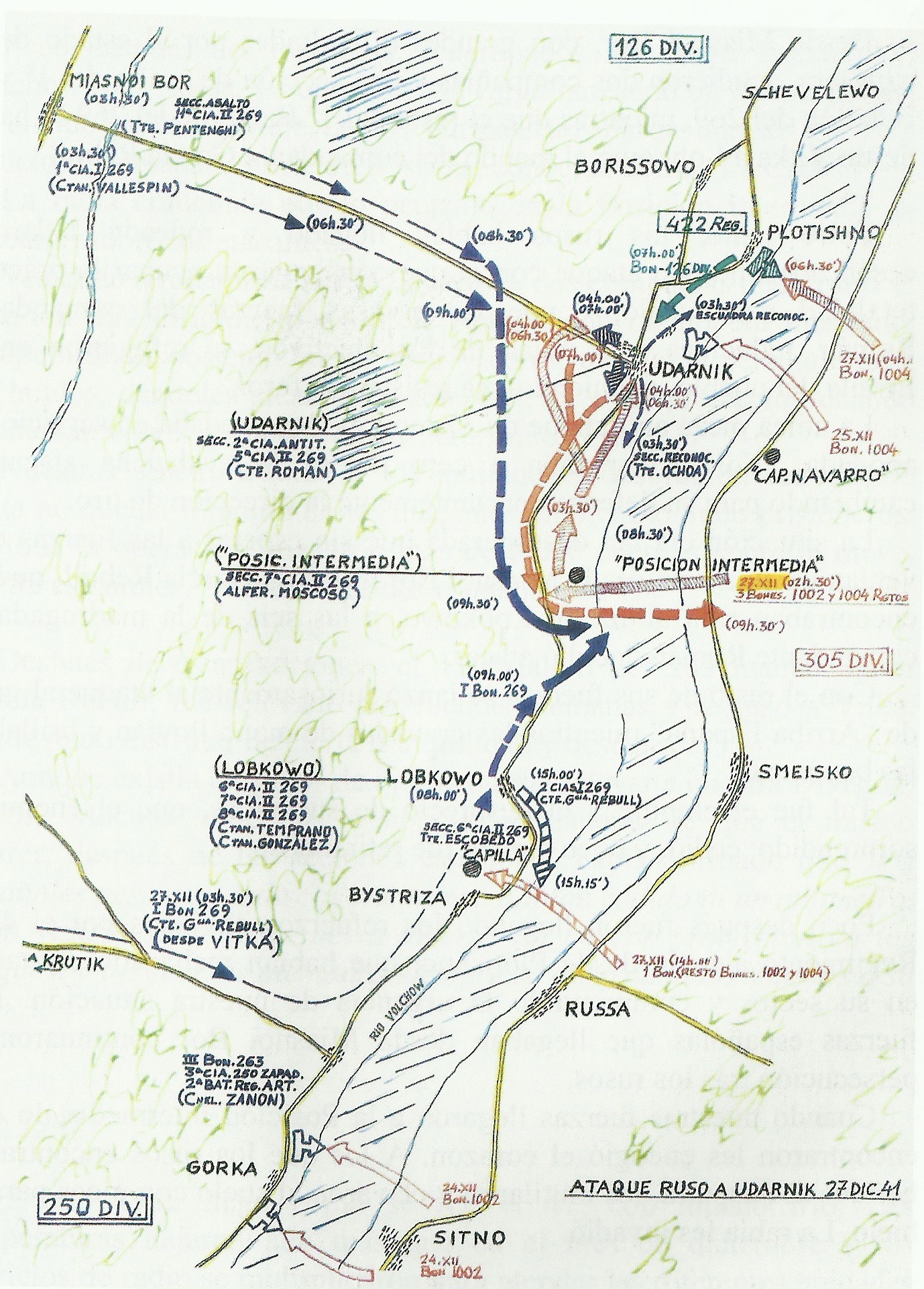 Los soviéticos no dejaban de meter presión en el frente del Volchov, de manera que en diciembre fueron constantes los bombardeos y golpes de mano. El 24 de diciembre penetraron el río en dos sitios y el día de Navidad realizaron tres ataques en el frente de la división. Pero el mayor ataque tuvo lugar el 27 de diciembre sobre la localidad de Udarnik. Ese día el 422º Regimiento de la 126º División alemana fue atacado por rusos en Plotishno, al norte de Udarnik, siendo rechazados tras duros combates. Al mismo tiempo, sobre las 02:30 horas de ese día, un regimiento ruso atacó la Posición Intermedia que enlazaza el sur de Udarnik con la localidad de Lobkowo. La posición estaba defendida por una sección de la compañía 7ª/II/269 al mando del alférez Rubio Moscoso. El mando español evaluó la fuerza atacante en tres batallones, y enseguida envió refuerzos desde dos posiciones: en el sur, desde Vitka y Lobkowo enviaron al Batallón I/269 del comandante García Rebull; desde Miasnoi Bor, más a retaguardia, enviaron dos compañías y una sección de asalto de los batallones I/269 y II/269.