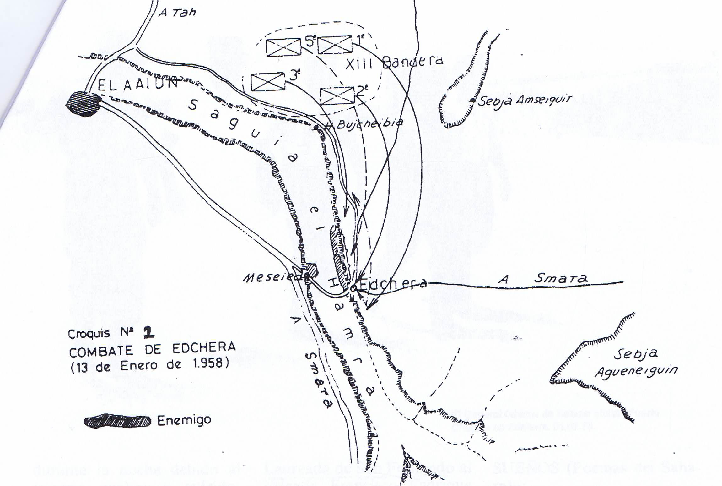 A las siete de la mañana del 13 de enero de 1958, la XIII Bandera salió de El Aaiun al mando de su jefe, el comandante Rivas Nadal, al completo de sus efectivos. Se dirigía hacia Edchera por la orilla derecha de la Saguía el Hamra para efectuar otro reconocimiento armado sobre el contingente de bandas rebeldes asentado en aquella zona. El despliegue de la columna era el siguiente: