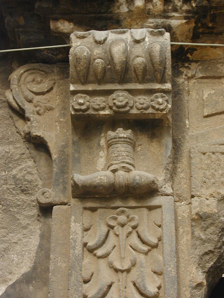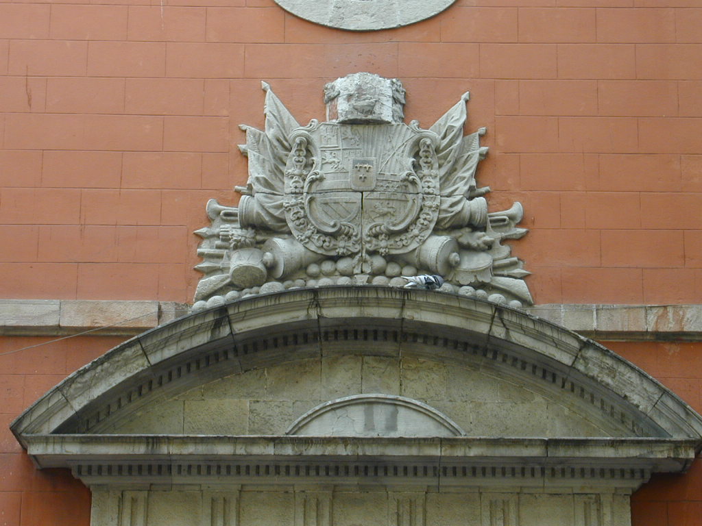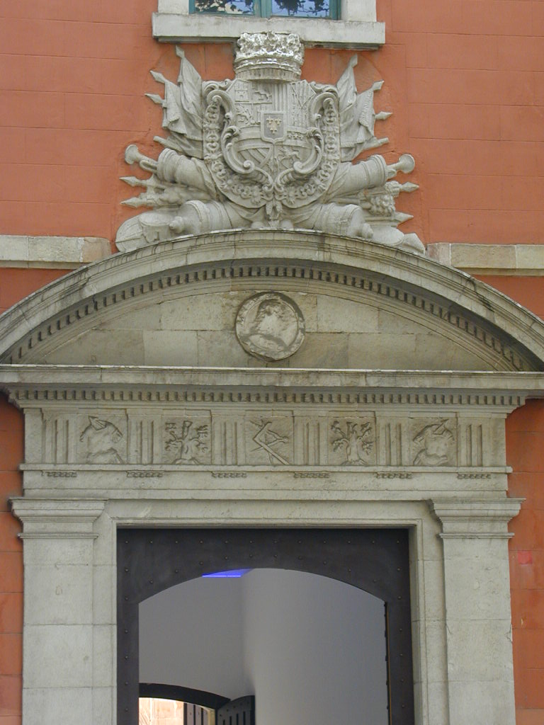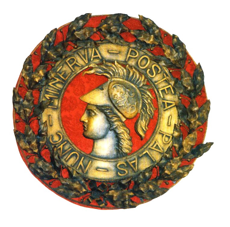 Rosetón que adornaba el fronstispicio de la Academia en Barcelona. Representa a la diosa Minerva, rodeada del lema "NUNC MINERVA, POSTEA PALAS", que simboliza la importancia que tiene el conocimiento teórico para despues aplicarlo en la guerra."