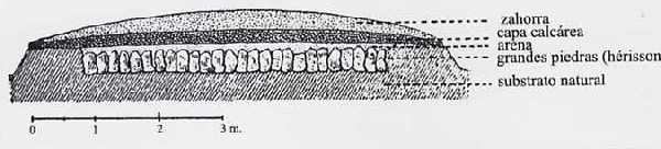 El terreno natural, primeramente, se cubría con una ligera capa de arena o mortero, y sobre ésta, otra capa (de 25 a 60 cm. de espesor) de piedras planas, llamada statumen.