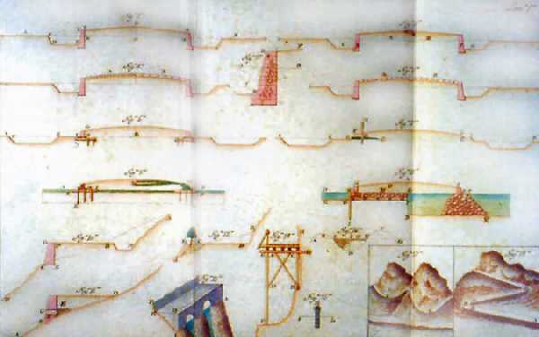 [6].- Muller, Juan, Tratado de Fortificación, o Arte de construir los Edificios Militares y Civiles. Traducido del inglés por el ingeniero militar Miguel Sanchez Taramas. Este ingeniero, que fue director de la Academia de Matemáticas de Barcelona, añadió al texto original de Muller, numerosas tablas y dibujos de puentes.