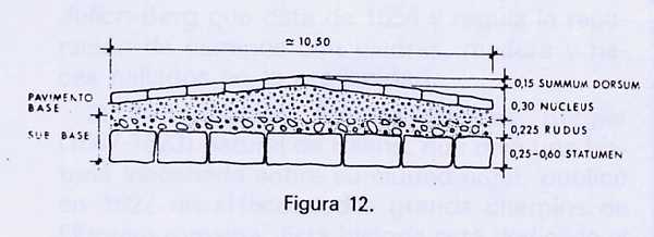 Para estos historiadores, basándose en numerosos estudios arqueológicos, como ya se indicó, tanto en Francia como en España, la sección tipo de una calzada romana, simplificando quizás excesivamente la cuestión, sería la siguiente: Sobre el terreno natural se colocaba (a veces y según la naturaleza del terreno, se clavaba) una capa de cimentación formada por piedras de grueso tamaño, capaces de soportar todo el paquete de firmes y establecidas de modo que apenas pudiesen admitir otras mas pequeñas en los intersticios. Sobre la anterior, se colocaba al menos (podían ser varias, en cuyo caso iba decreciendo el grueso de las piedras) una capa de transición con piedras de menor tamaño. La última de las capas, era la de rodadura, compuesta de materiales de grano fino (todo ello apisonado), que facilitaba el tránsito, tanto de ganado como de vehículos de ruedas. Finalmente, todas las capas a su vez, estaban enmarcadas por un bordillo de piedra. A esta sección se le daba generalmente un bombeo, que junto a las cunetas, tenía por misión facilitar la evacuación de las aguas. Estas vías, y en contraposición por lo sostenido hasta la aparición de esta nueva corriente histórica, permitían un tránsito rápido de un punto a otro.