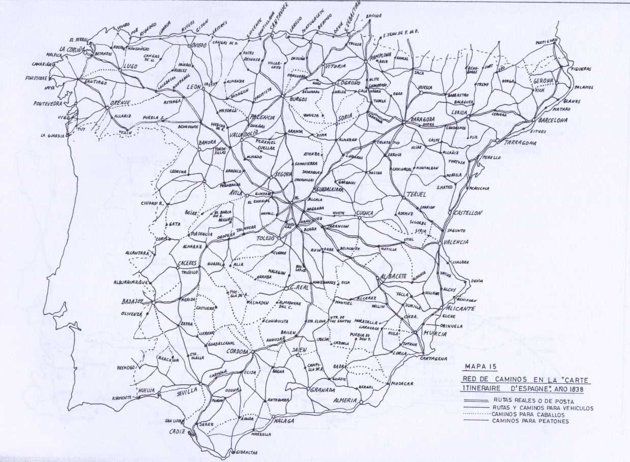 Como conclusión de todo lo que hemos visto hasta el momento, podemos señalar que, en España, y una vez desaparecidas en buena parte las calzadas romanas por el paso de los siglos y su abandono, los caminos existentes hasta mediados del siglo XVIII, eran de tierra, que se volvían impracticables durante buena parte del año, e incluso que llegaban a roturar los campesinos, para su aprovechamiento agrícola, lo que obligaba a rodeos que alargaban las jornadas necesarias para ir de un lugar a otro. Ni que decir tiene que en su mayor parte se trataba de caminos de herradura, que encarecían el transporte de mercancías, y obligaban a los viajeros a hacer sus traslados sobre lomo de caballo o mulo, o en todo caso sobre silla de manos.