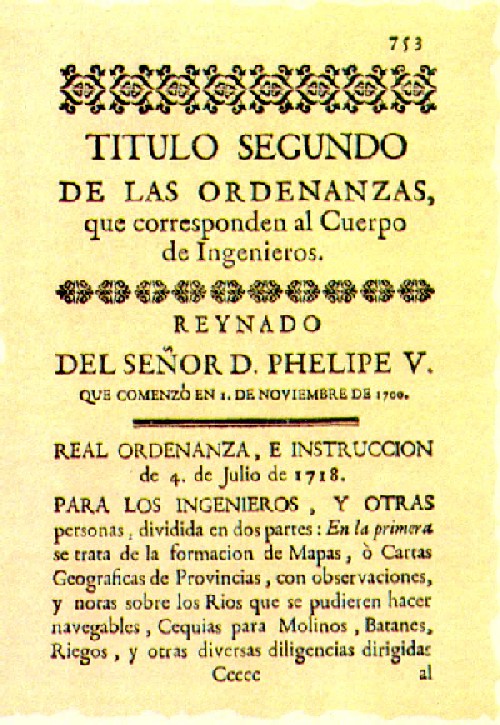 Real Ordenanza e Instrucción de 4 de julio de 1718 para los Ingenieros, y otras personas, dividida en dos partes: En la primera se trata de la formación de Mapas, o Cartas Geográficas de Provincias, con observaciones y notas sobre los Rios que se pudieren hacer navegables, Cequias para Molinos, Batanes, Riegos, y otras diversas diligencias dirigidas al beneficio universal de los Pueblos; y asimismo al reconocimiento y formación de Planos, y Relaciones de Plazas, Puertos de Mar, Bahías, y Costas, y de los reparos, y nuevas obras que necesitaren, con el tanteo de su coste: En la segunda se expresan los reconocimientos, tanteos y formalidades con que se han de proponer, determinar y executar los obras nuevas, y los reparos que fueren precios en las Fortificaciones, Almacenes, Quarteles, Muelles y otras Fábricas Reales, y sobre conservación de las Plazas, y Puertos de Mar.