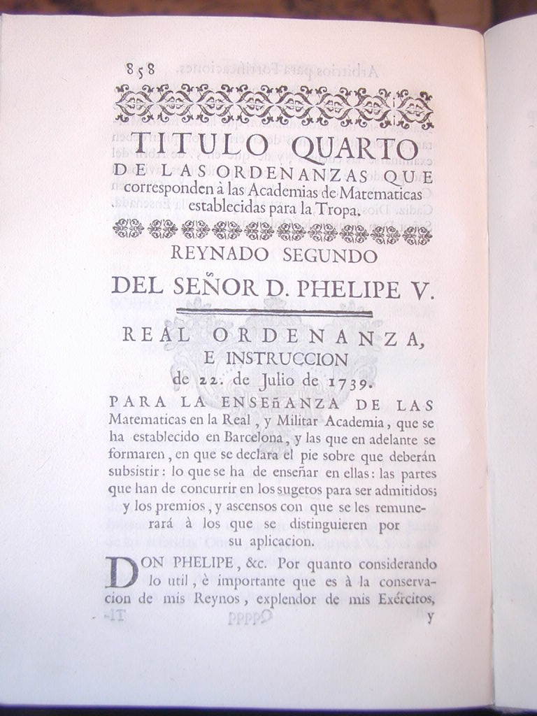 DON PHELIPE, etc. Por quanto considerando lo útil é importante que es á la conservación de mis Reynos, explendor de mis Exércitos y bien de mis Vasallos que entre ellos haya sugetos inteligentes en la Matemática, de que dimanan los seguros aciertos de las operaciones Militares, Marítimas, y demás que se necesitan para el bien del público;