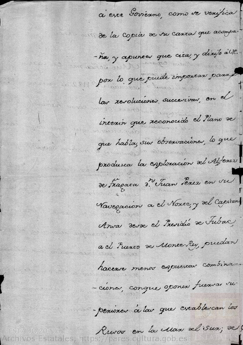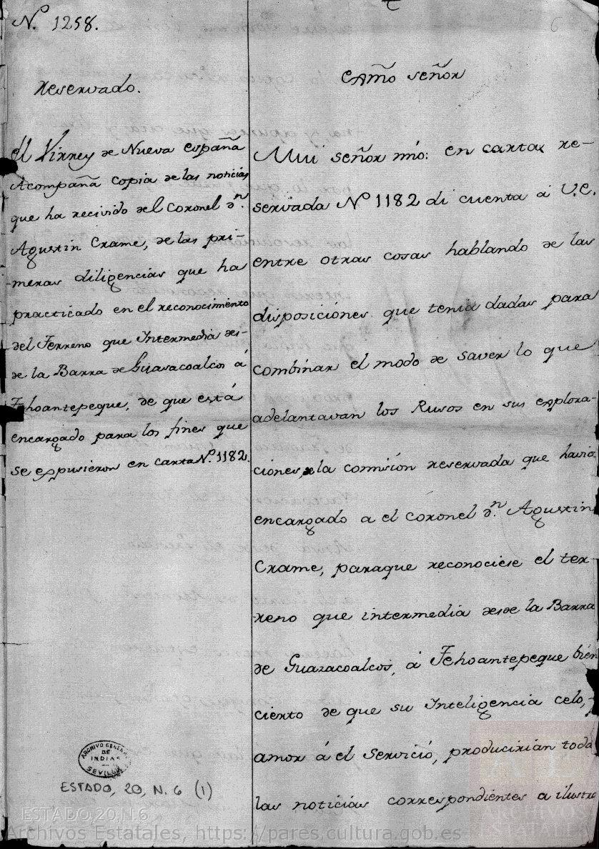 Mui señor mío: en carta reservada nº 1182 di cuenta a V.E. entre otras cosas, hablando de las disposiciones que tenia dadas para combinar el modo de saver lo que adelantaban los Rusos en sus exploraciones, de la comisión reservada que havia encargado a el coronel Don Agustín Crame, para que reconociese el terreno que intermedia desde la Barra de Guazacoalcos a Tehuantepeque, bien cierto de que su Inteligencia, delo, amor a el Servicio, producirían todas las noticias correspondientes a ilustrar a este Govierno, como se verifica de la copia de su carta que acompaña, y apuntes que cita, y dirijo a V.E. por lo que puede importar para las resoluciones sucesivas en el interim que reconocido el Plano de que habla, sus observaciones, lo que produzca la exploración del Alférez de Fragata don Juan Pérz en su Navegación a el Norte, y del Capitán Ansa desde el Presidio de Tubac a el Puerto de Monte-Rey, puedan hacerse menos expuestas combinaciones, conque oponer fuerzas superiores a las que establezcan los Rusos en la Mar del Sur, de que pido a V.E. se sirva dar cuenta a S.M.